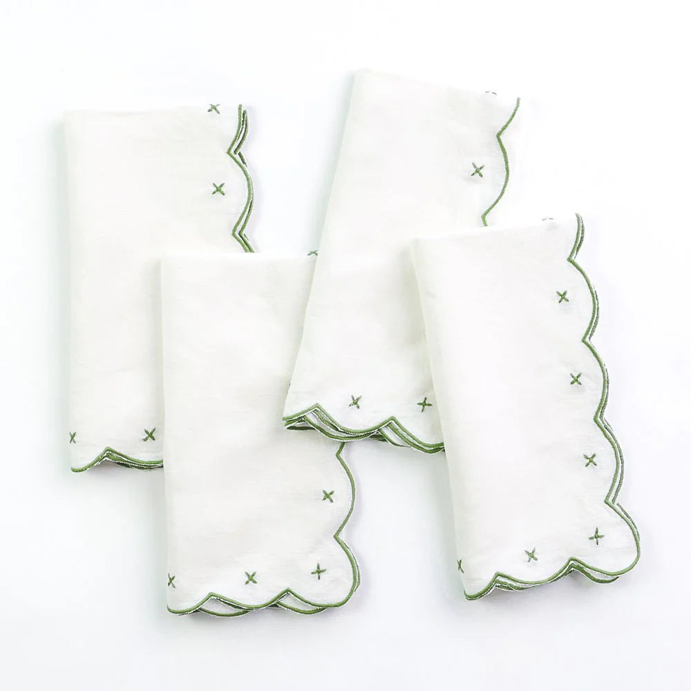 These elegant white linen napkins feature intricate green embroidery and a delicately scalloped edge. Perfect for adding a touch of sophistication to any table setting, the set of four is sure to impress guests and elevate your dining experience.