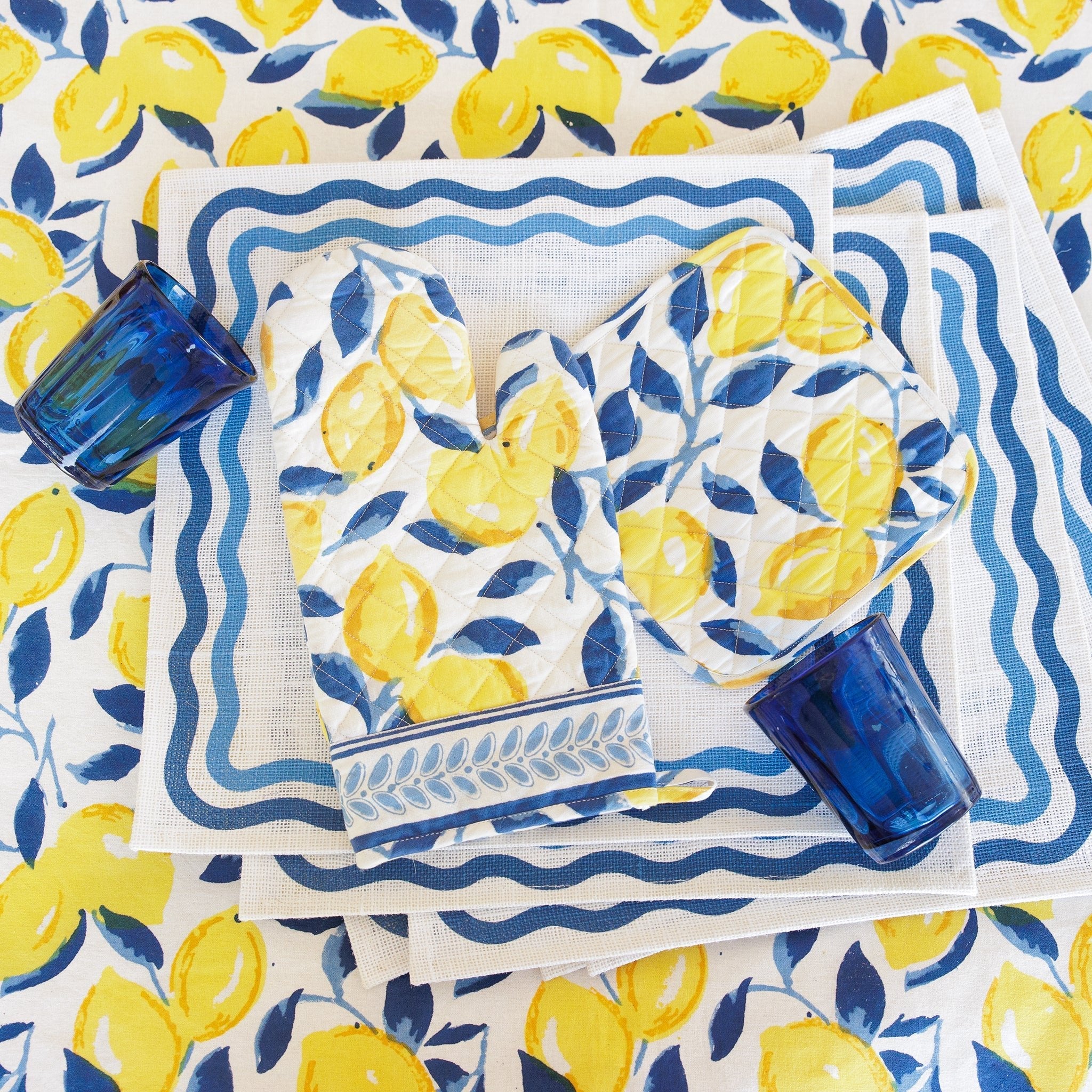 Vibrant yellow lemons on rich navy branches make up this cheerful, block-printed pattern. Protect your hands in style with this oven mitt and potholder.