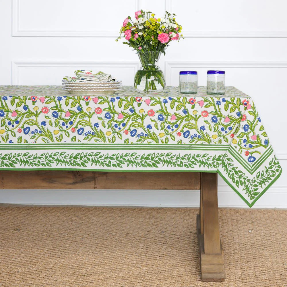 Handmade in India using traditional printing techniques, each tablecloth carries with it the character and quality of artisan craftsmanship. It’s easy to care for, machine washable, and designed to become a staple in your seasonal rotation. Pair it with coordinating Green Bamboo napkins for a cohesive look, or mix with textured neutrals and floral prints for a curated, eclectic feel.