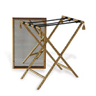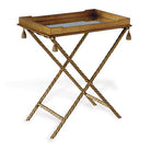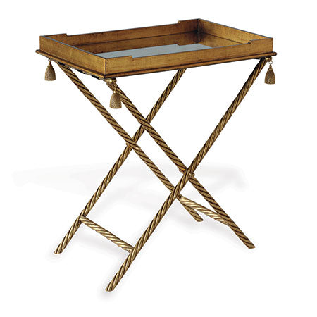 The Delfern bar brings to mind gatherings with festive friends, cocktails and nibbles at the House of Bedlam, Madcap Cottage's home in High Point, NC. The bar is inspired by decorative rope trim and glorious tassels at each corner. Made of steel with a hand applied gold leaf stand. It is collapsible for easy storage. The wood tray simply rests on the stand, and is finished in gold leaf with a antiqued mirror interior surface. It is velvet lined for protection if used on a wood table.