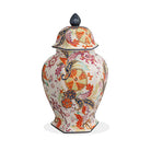 This hex shaped porcelain jar has a lift off lid. The jar is highlighted with a dark navy blue decorative detail. The jar is scaled for the decorative shelf or as a pair on the mantle. Jars are individually sold.