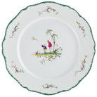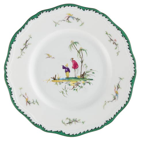 The Raynaud Longjiang Bread & Butter Plate #4 is a captivating piece of fine porcelain, crafted in the world-famous Limoges region of France. This exquisite dinnerware draws its inspiration from the works of Jean Pillement, an 18th-century Rococo painter known for his idyllic portrayals of Chinese countryside life. Each plate showcases intricate hand-painted motifs in vibrant colors, framed by a refined green border that adds an elegant touch to the design.