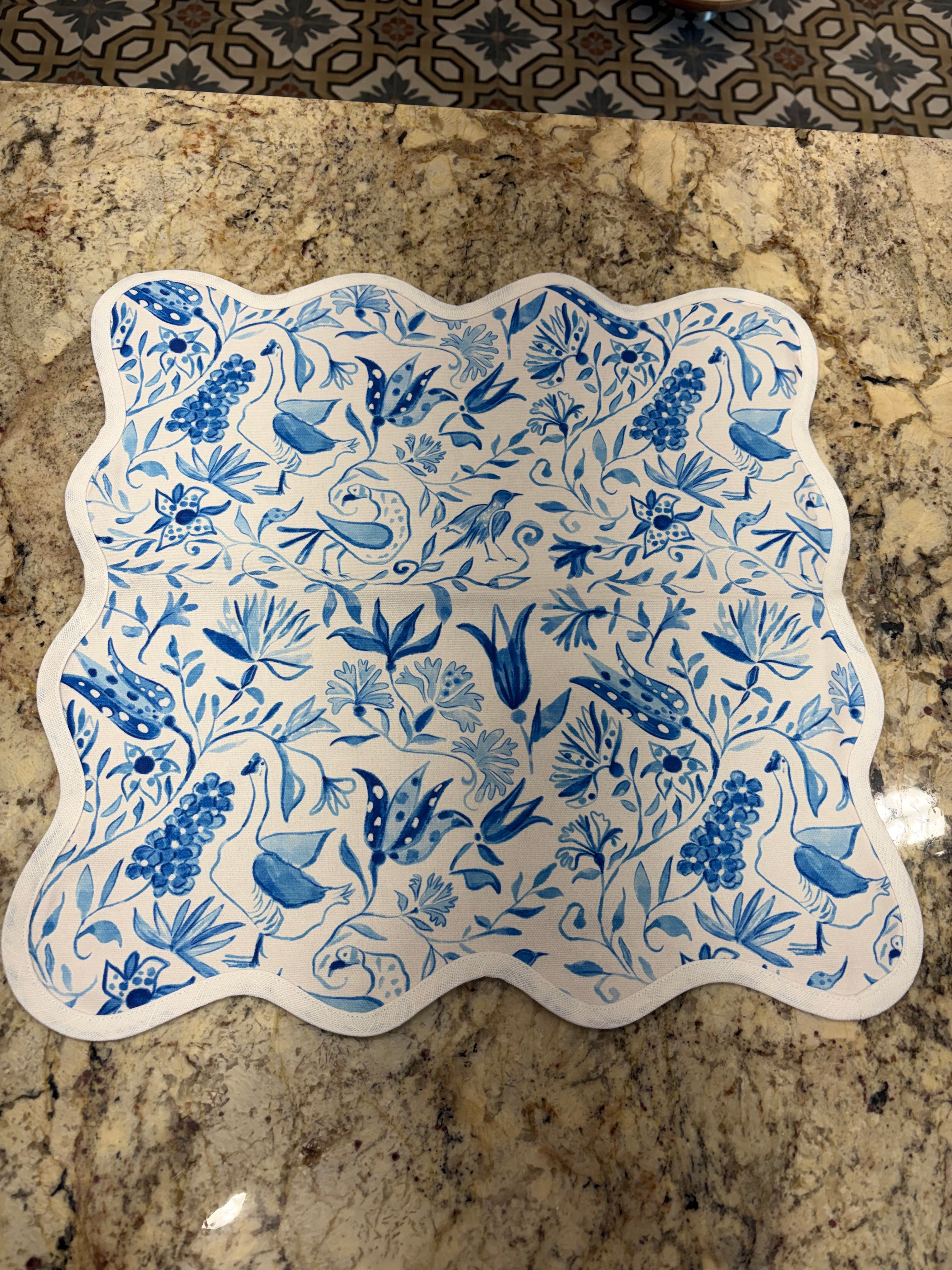 Linen Square Scalloped Placemat Birds of Paradise-Blue