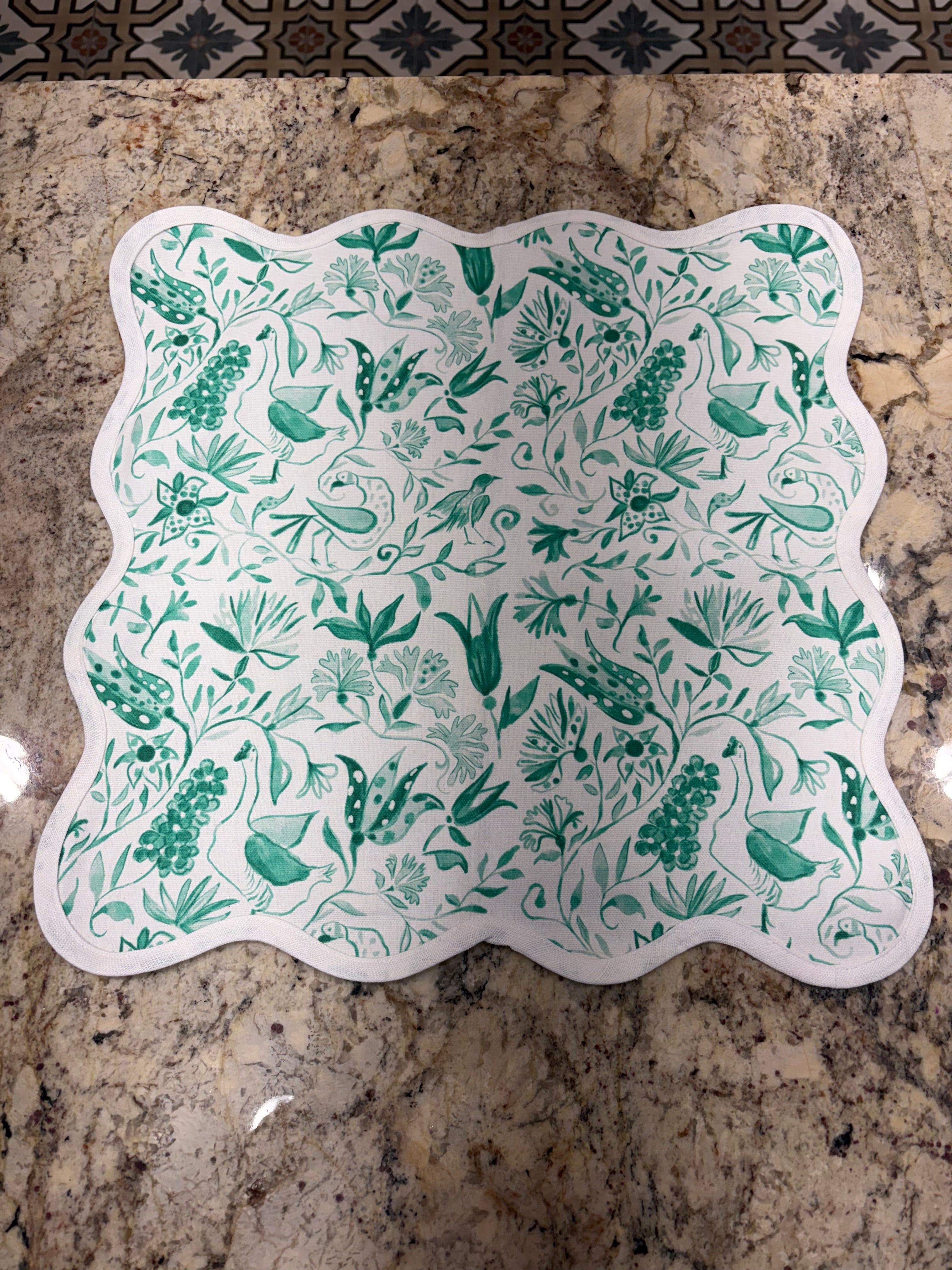Linen Square Scalloped Placemat Birds of Paradise-Green