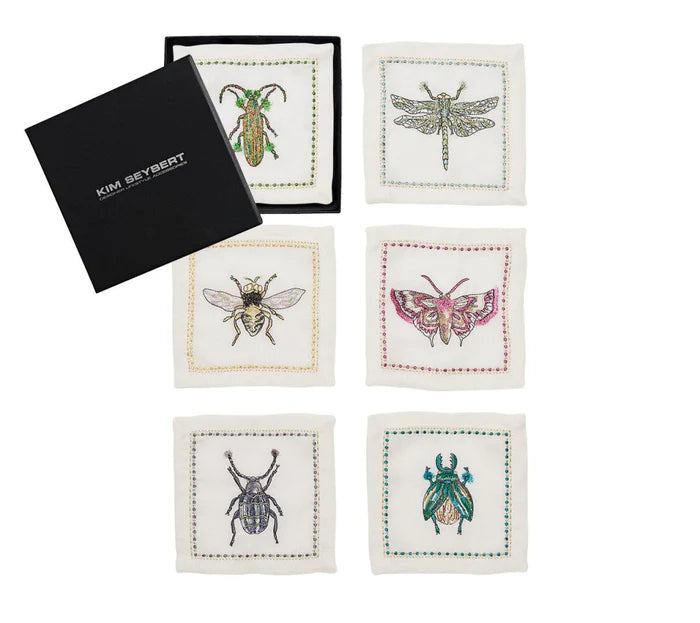 Inspired by incredible garden insects, the Garden Party Cocktail Napkins feature stunning embroidery. Hand-drawn multicolor insects are embroidered using metallic and iridescent thread onto crisp, white linen. These colorful and imaginative critters are the perfect garden party guests!