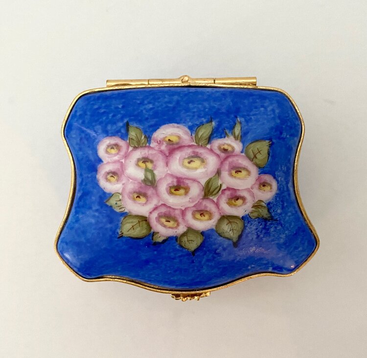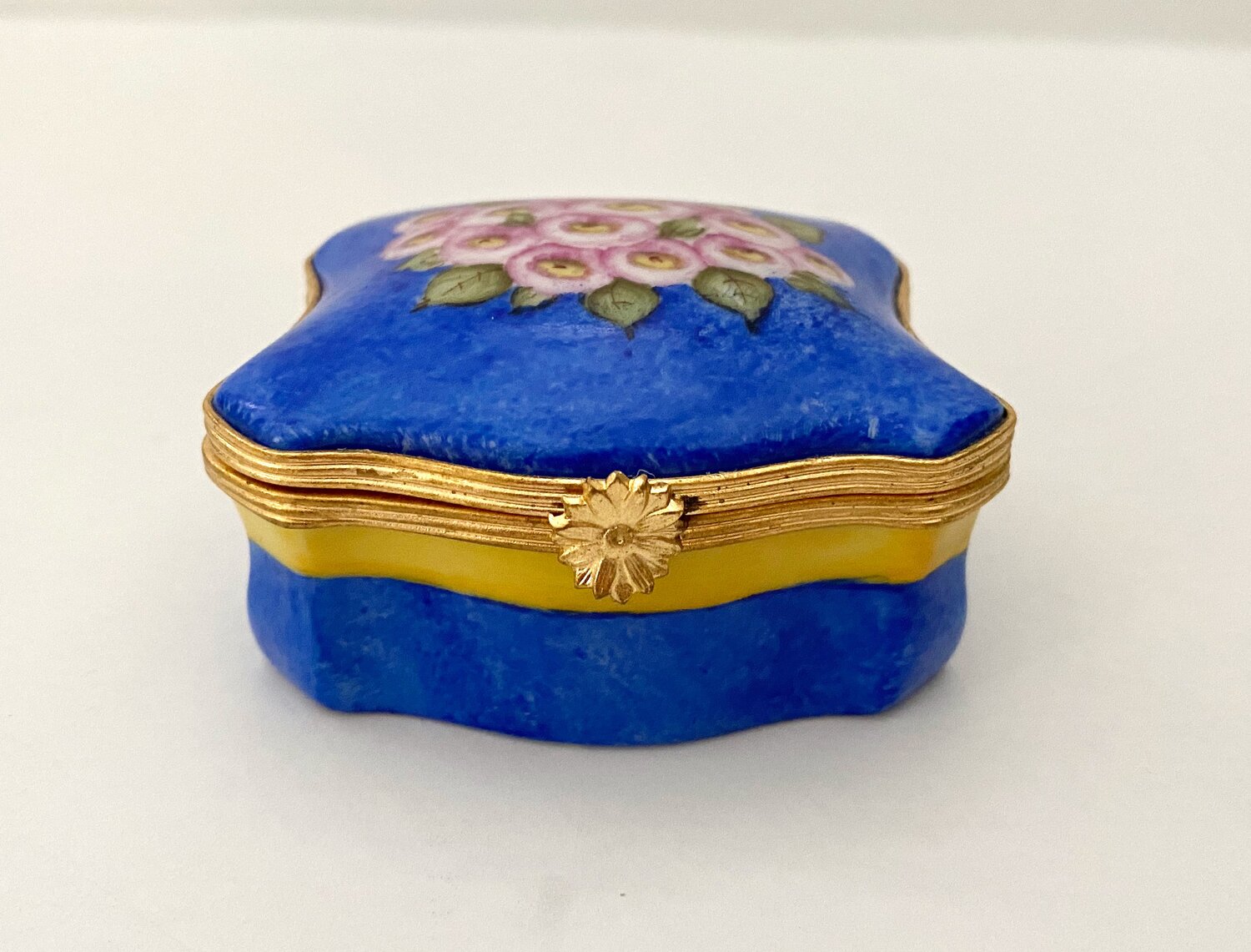 This compact 3" x 2" hand-painted porcelain box showcases exquisite blue floral detailing with a glossy finish. Perfect for collectors or as a distinguished gift, this Limoges piece embodies exceptional craftsmanship and enduring elegance.