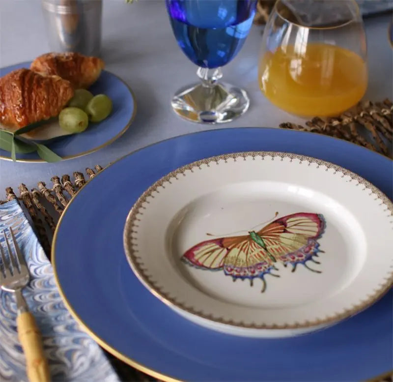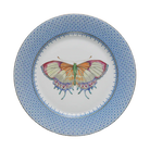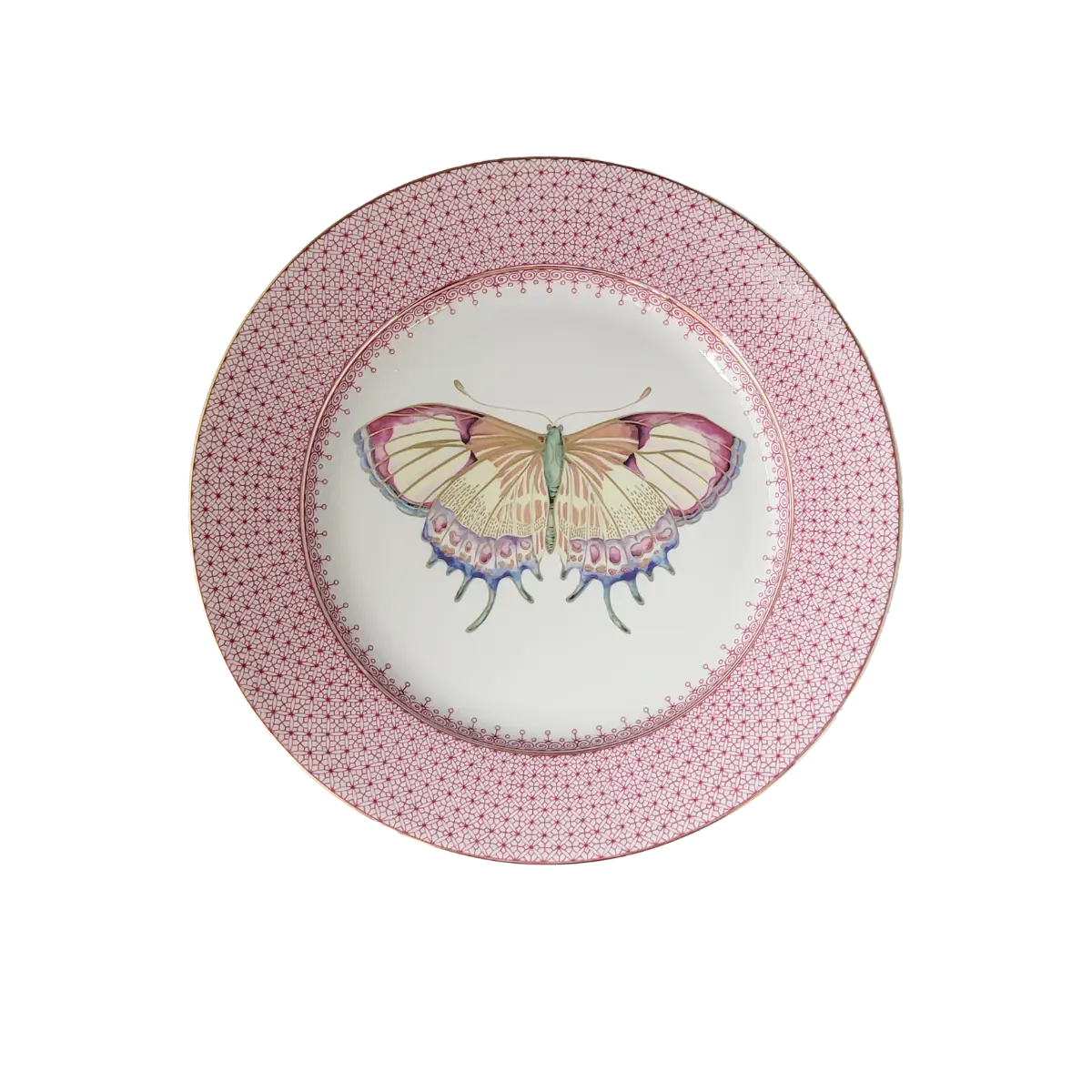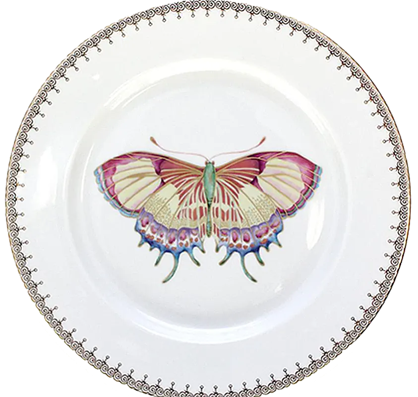 Our Apple Green, Cornflower, Golden Teardrop, Green, and Pink Lace Dessert Plates will add an extra layer of beauty to your dining experience. Each plate features a colorful butterfly, providing a vibrant focal point for your table. All plates measure 8.5 inches in diameter, making them ideal for serving your favorite desserts. A unique design complements a wide range of patterns, while the 22k gold accents lend an extra touch of luxury. Perfect for any special occasion. Add a touch of elegance and sophistication to your dining table with our stunning Lace Dessert Plate with Butterfly.