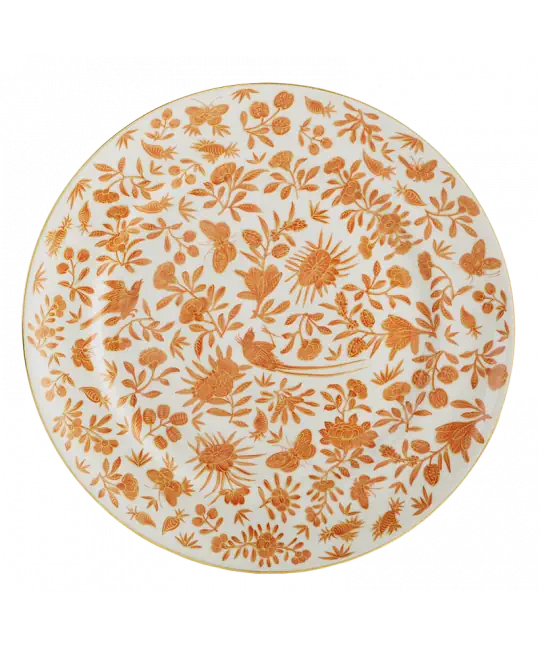 The Sacred Butterfly was a Chinese export pattern of about 1800 and was intended for those who admired the sophistication of placing traditional Chinese motifs of birds, butterflies and flowers on European shapes. The Chinese word for butterfly, tieh, is a pun which expresses the wish that the owner might live to a ripe age. These motifs were rendered with characteristic understatement in the traditional Chinese orange and gold colors in an all-over pattern. The marriage of shape and design was a success and was reproduced in English china of about 1800-1810. Our reproductions are based on originals in Historic Charleston. Dishwasher safe.