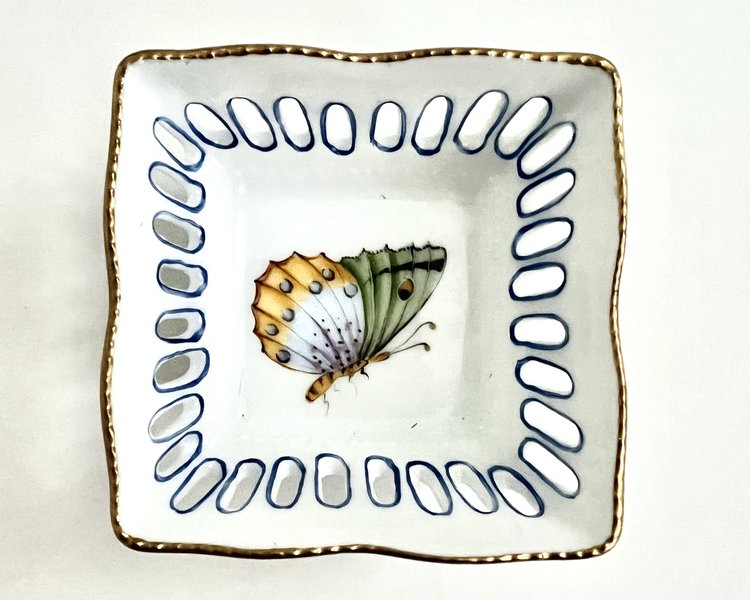 Measuring just 2 1/4 inches in length, the dish features a refined pierced design around its edge, lending an airy, lace-like quality to the porcelain. At its center, a graceful butterfly is depicted in vivid, lifelike detail—each stroke carefully painted by hand. The entire piece is embellished with luminous 24-karat gold, adding a touch of opulence that elevates its classical beauty.