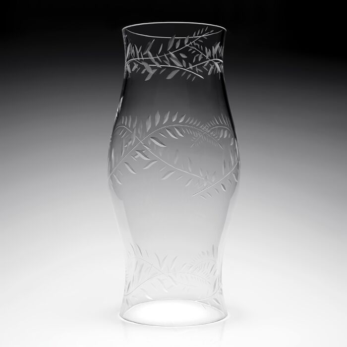 The William Yeoward "Jasmine" Country Collection features a stunning Jasmine Hurricane candle holder that stands at an impressive 18 inches tall. This large etched hurricane is designed to make a statement, whether placed on a table or a sideboard. The design includes the Jasmine Vine etching around the top, center, and base, giving it an elegant and stylish appearance. For optimal visual impact, it's recommended to use these hurricanes in pairs with candles, enhancing their beauty and creating a more balanced display.