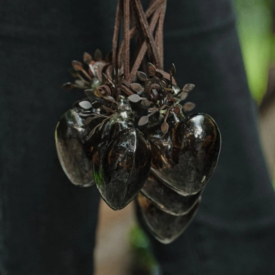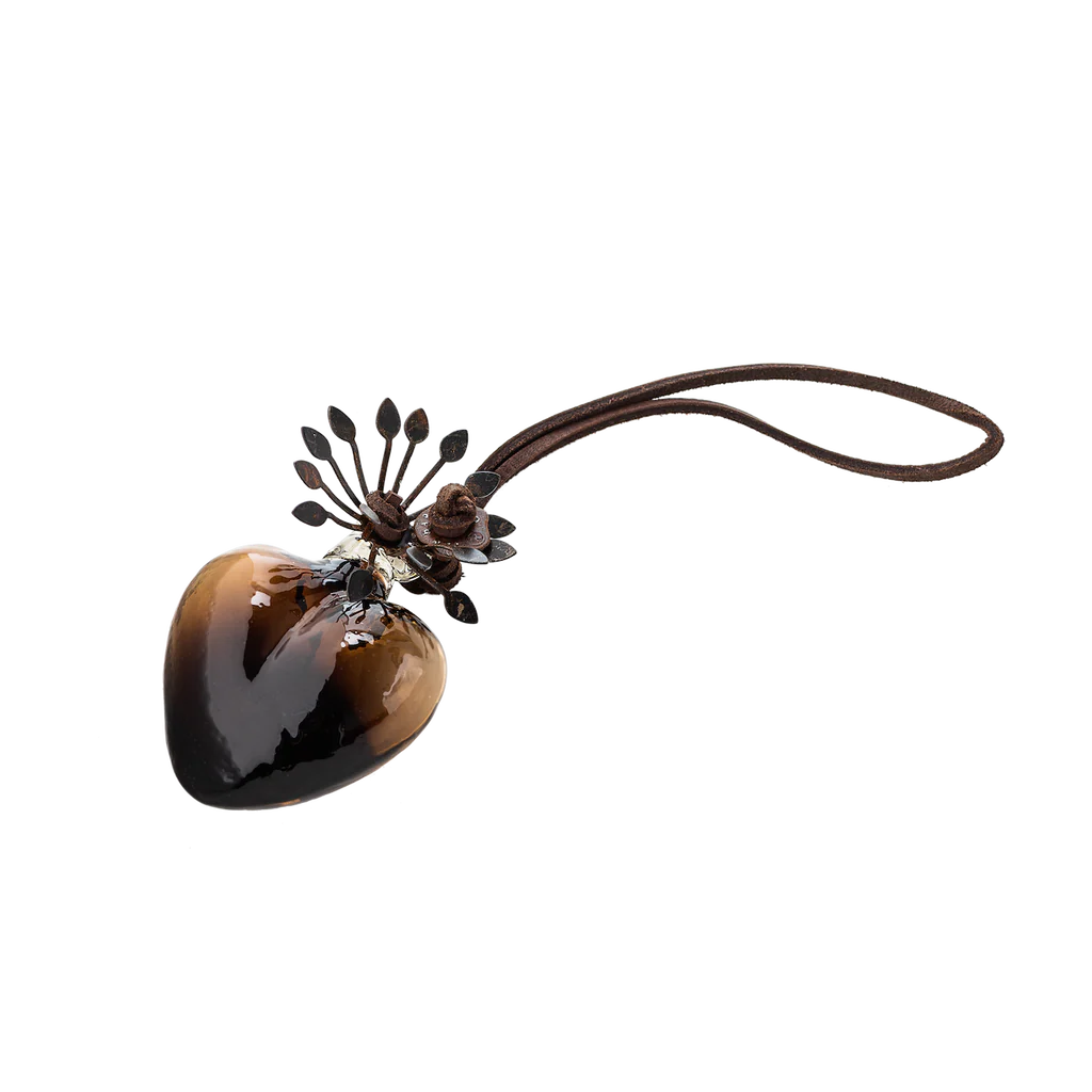 Adelita is a mouth-blown glass bathed in chocolate, rich in color and texture. On a leather cord Adelita can be hung from a tree, a door knob, and even on the wall. Experience luxury and artistry with every piece of ADELITA CHOCOLATE HEARTBLESSING. The intricate details of the mouth-blown glass, combined with the richness of the chocolate and the versatility of its leather cord, make it a stunning addition to any space. Whether it's displayed on a tree, a door knob, or mounted on the wall, ADELITA CHOCOLATE HEARTBLESSING is sure to add elegance and style to your home.