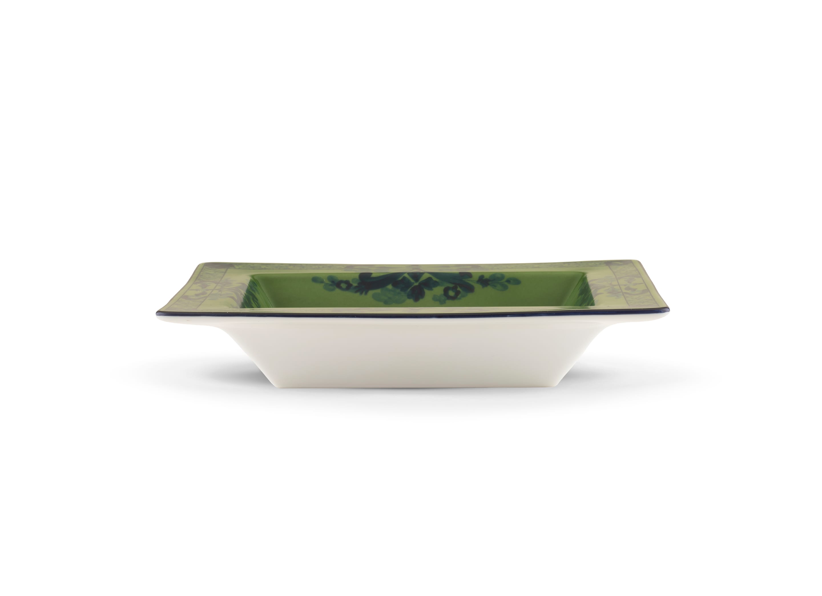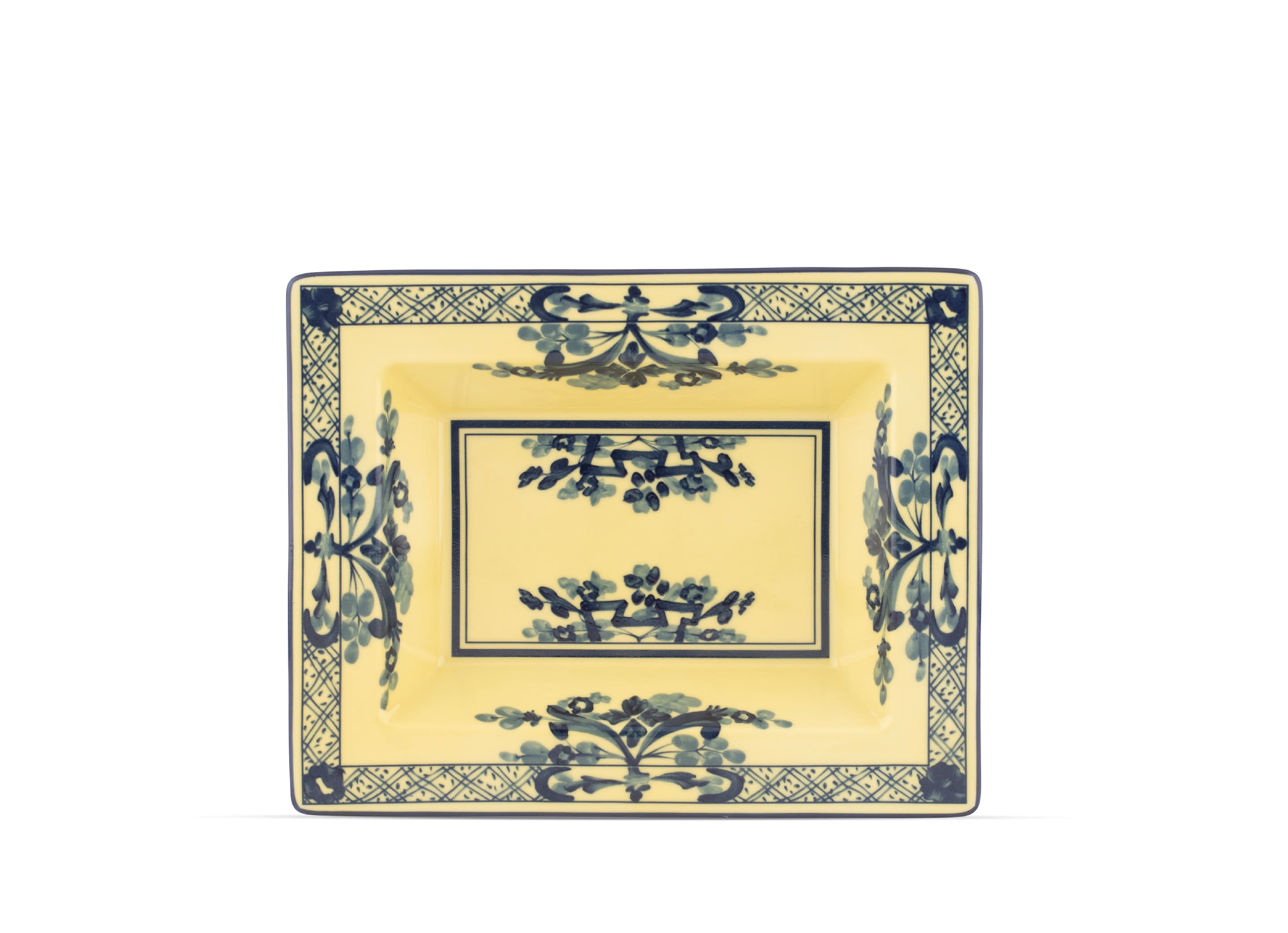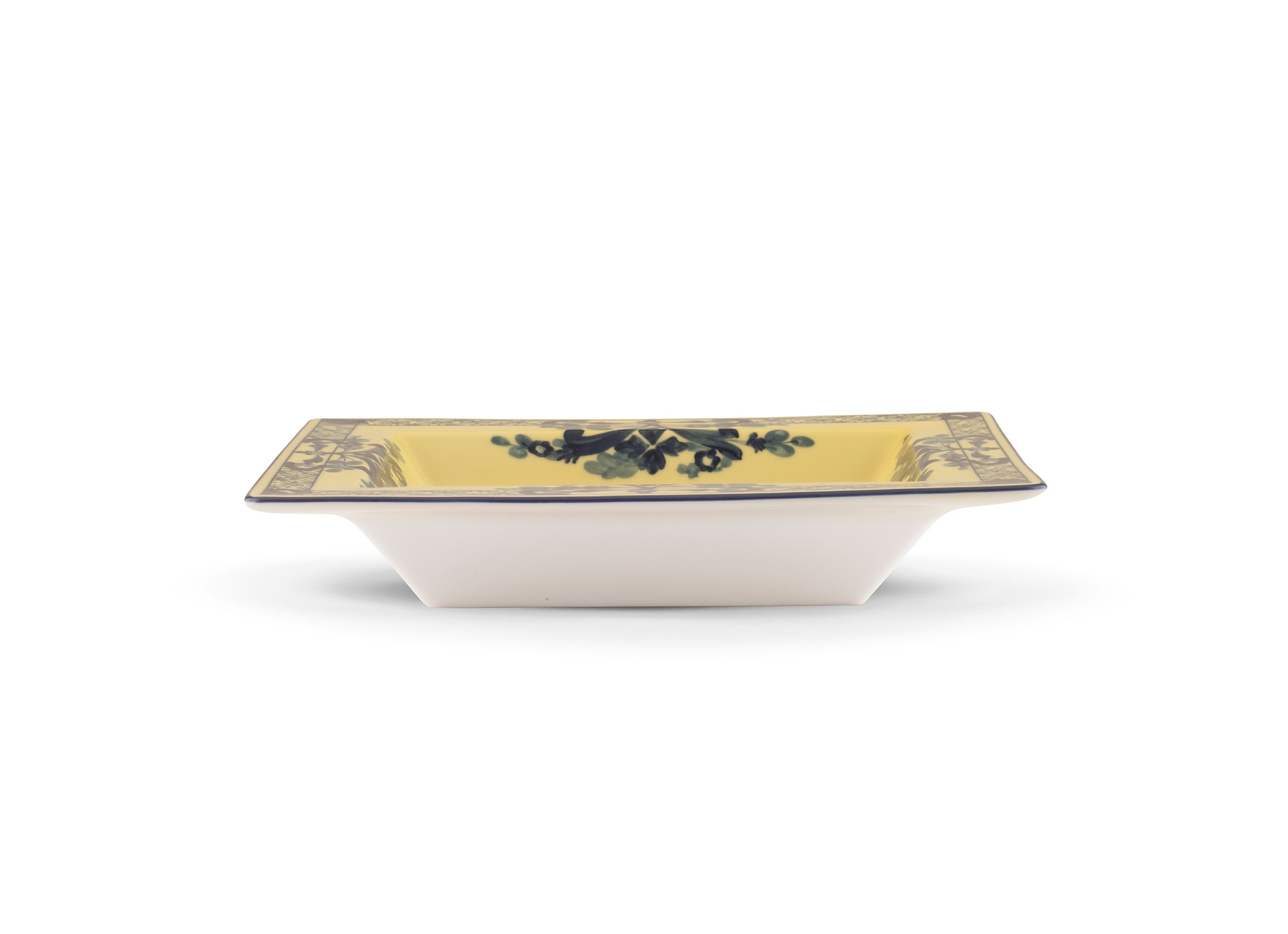 Introducing the Ginori 1735 Rectangular Vide Poche (Change Tray) Oriente Italiano – a timeless piece of elegance and luxury for your home. Available in a stunning Citrino shade and part of the exquisite Oriente Italiano Collection, this rectangular Vide Poche stands as a testament to the perfect fusion of tradition and artistry. Crafted on the Antico Doccia shape, this piece embodies the unmatched craftsmanship of Ginori 1735. Airbrushed with meticulous precision and adorned with a vibrant yellow finish, it boasts an intricate decorative interweaving of colors that set it apart as a true work of art.