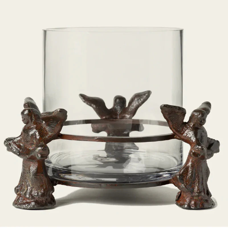 Three wax cast angels encircle a glass hurricane. . . for light, for ice, for blessings . . .