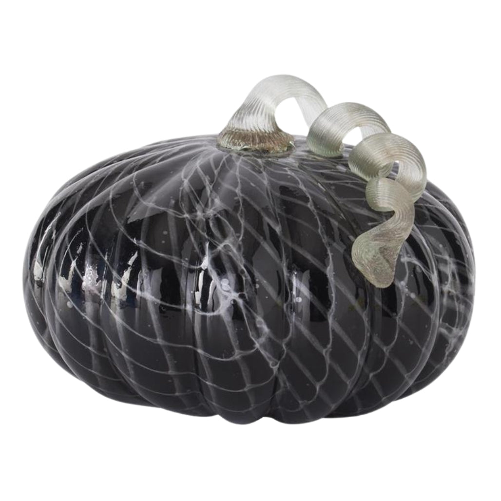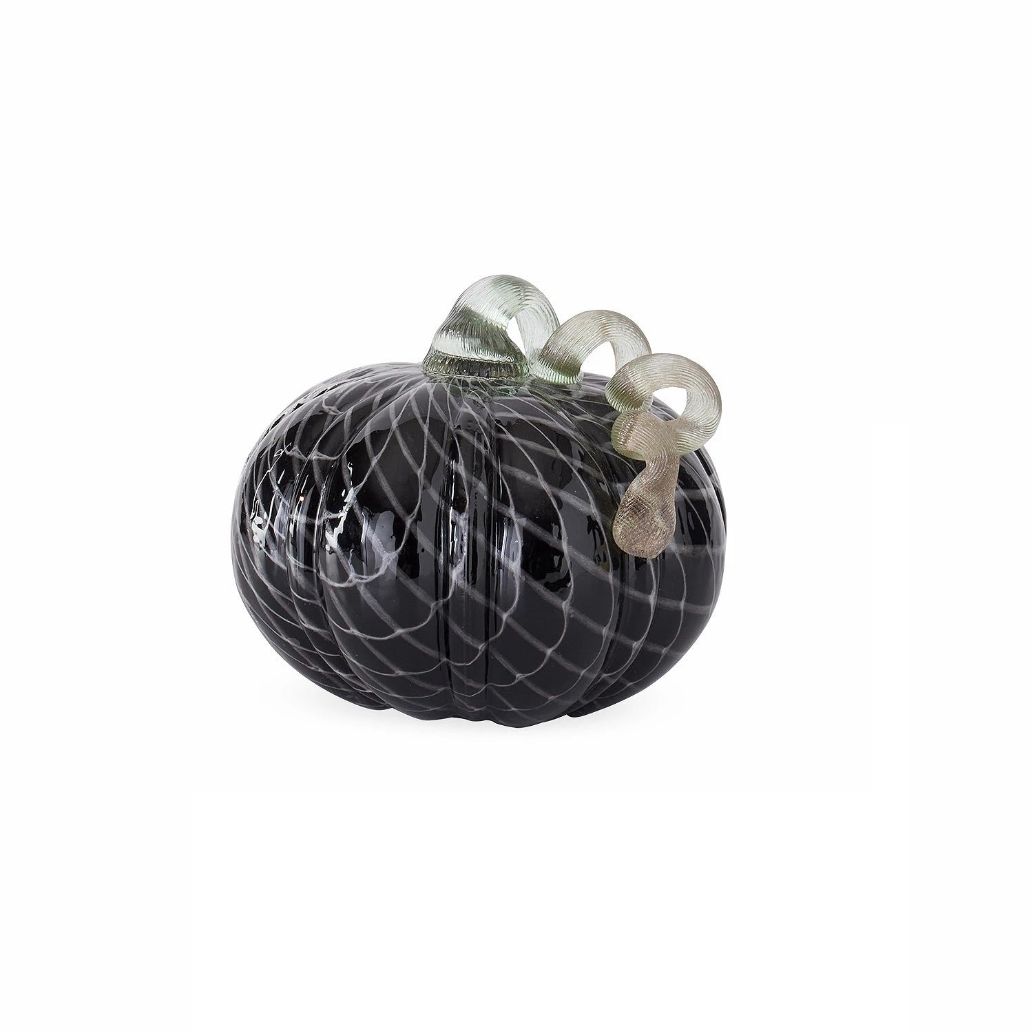 Add a touch of elegance to your autumn décor with this Black with White Swirls Handblown Glass Pumpkin. Standing at 4.5 inches tall, this artisanal glass pumpkin features intricate swirls and a delicate, curling stem, making it a stunning centerpiece or accent piece.