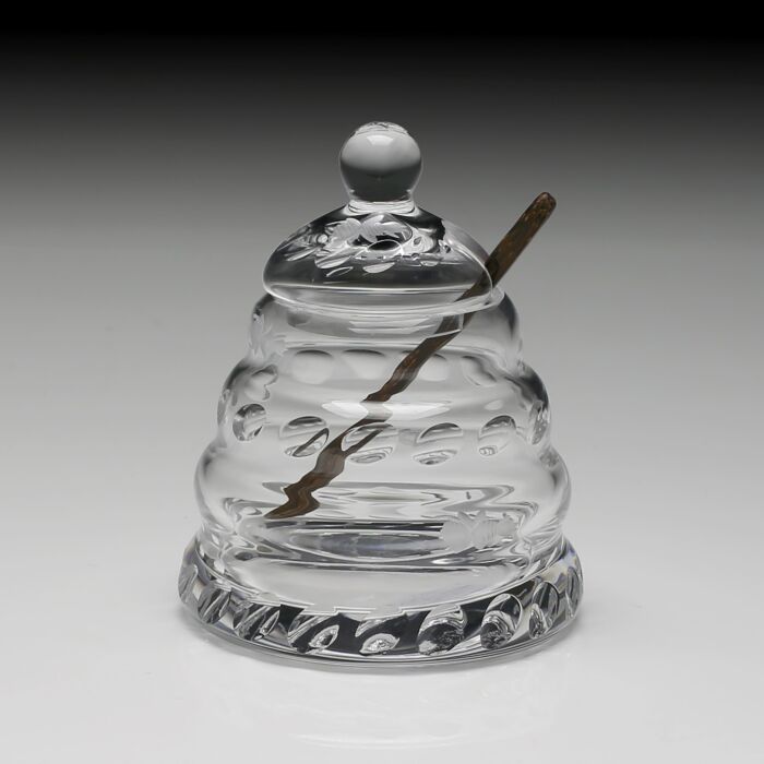 The Buzzy Honey Jar and Spoon is a work of art, featuring hand-cut bees circling around a hive, creating a beautiful visual story. Made from quality crystal, its clarity and shine add to the room's look. At 4½" (11cm), this jar not only holds a generous portion of honey, but also fits easily in your kitchen. The accompanying spoon adds convenience, allowing you to smoothly serve the honey. This Honey Jar and Spoon is an elegant piece of craftsmanship, but also has great utility. Make your cooking experience special with this impressive piece.- Buzzy Honey Jar and Spoon