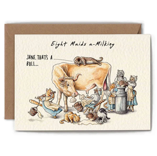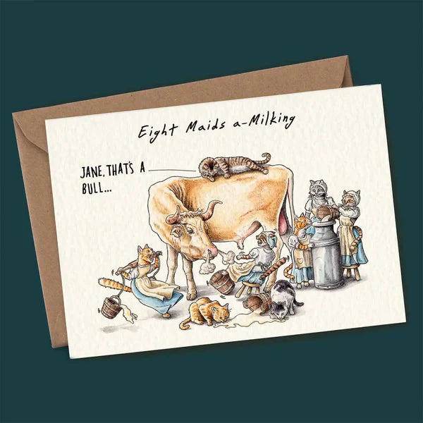Delight your friends with the quirky Eight Maids Milking card from Bewilderbeest, a brand that excels in blending humor with artistic flair. Based in the UK and known for its "Proudly Absurd" designs, Bewilderbeest brings you this unique and hilarious take on a traditional holiday theme. The card showcases a whimsical illustration of eight maids, humorously reinterpreted with playful details and clever animal twists, guaranteed to get a laugh.