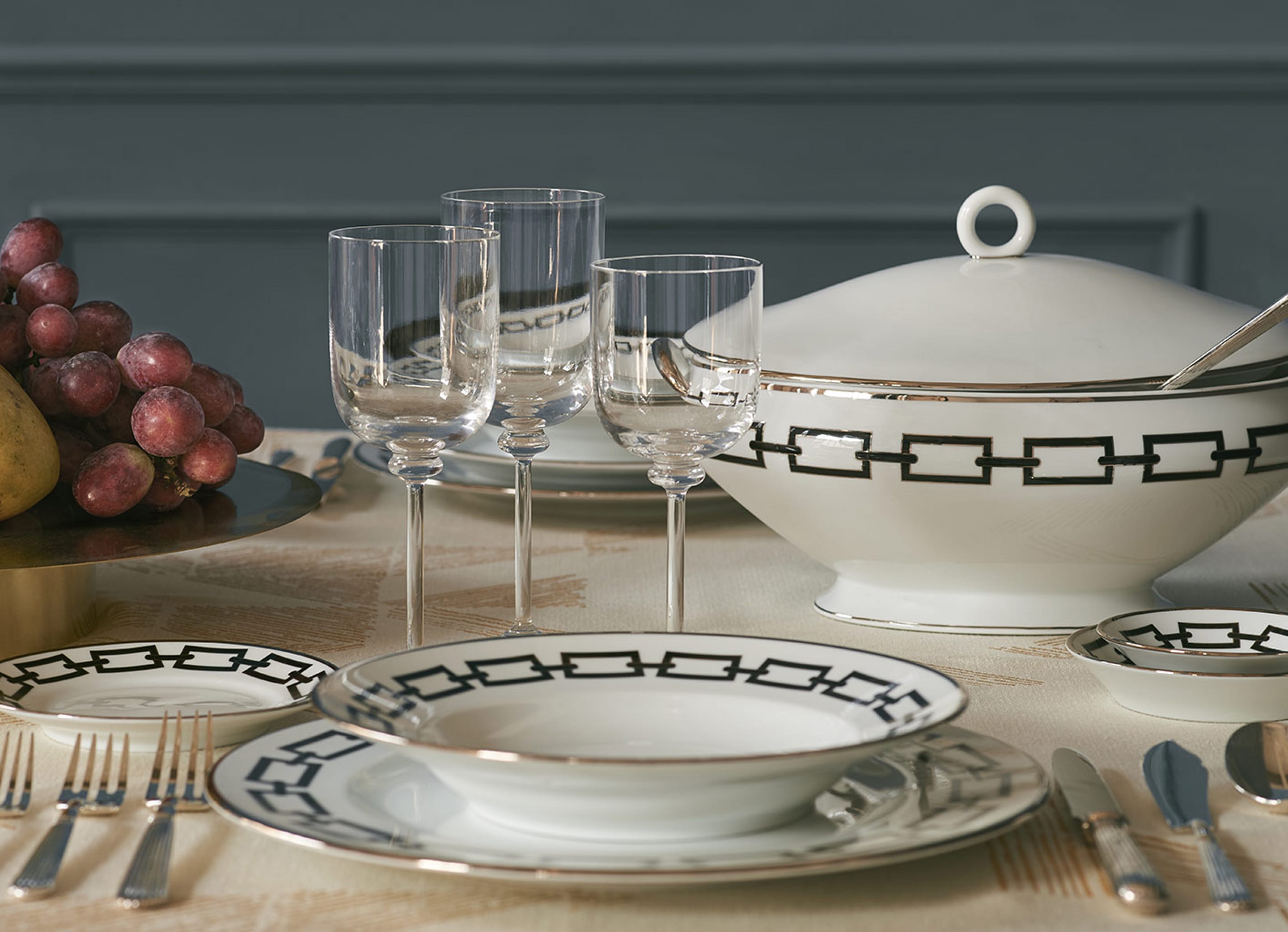 The minimalist elegance of the Catene pattern is seamlessly combined with the grace of our historic Impero line. Each plate is meticulously finished with a lustrous gold trim, a trademark of our commitment to luxury and sophistication.