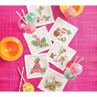 The Tropicana Cocktail Napkins feature vivid hand-drawn vignettes showcasing classic summertime cocktails. Each of the six linen cocktail napkins depicts different colorful embroidered motifs.