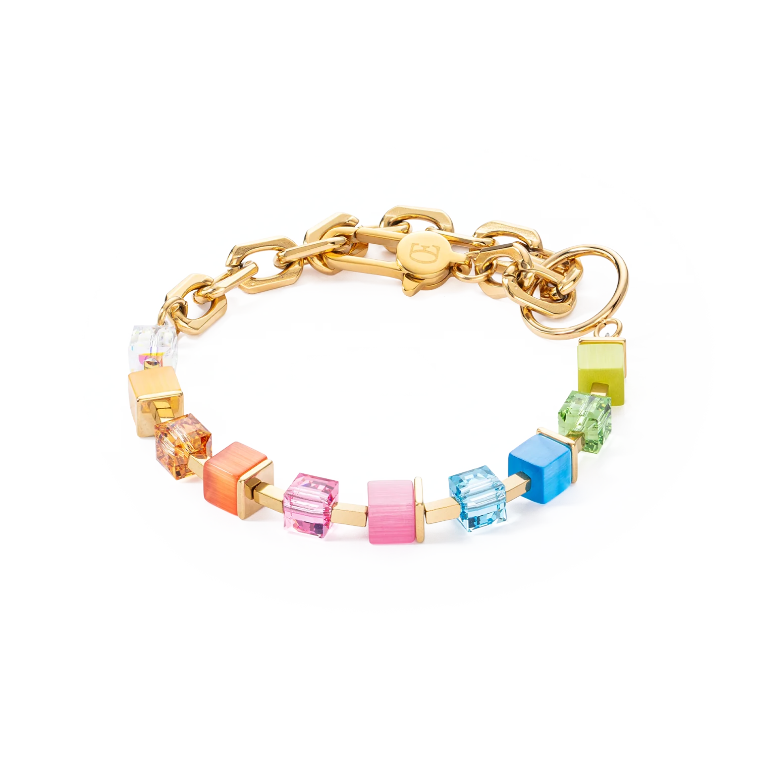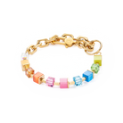 Discover the Cube Fusion Charm bracelet gold-rainbow, a new cube look combined with a shiny golden stainless steel chain. The bracelet can be integrated into the necklace as an extension.