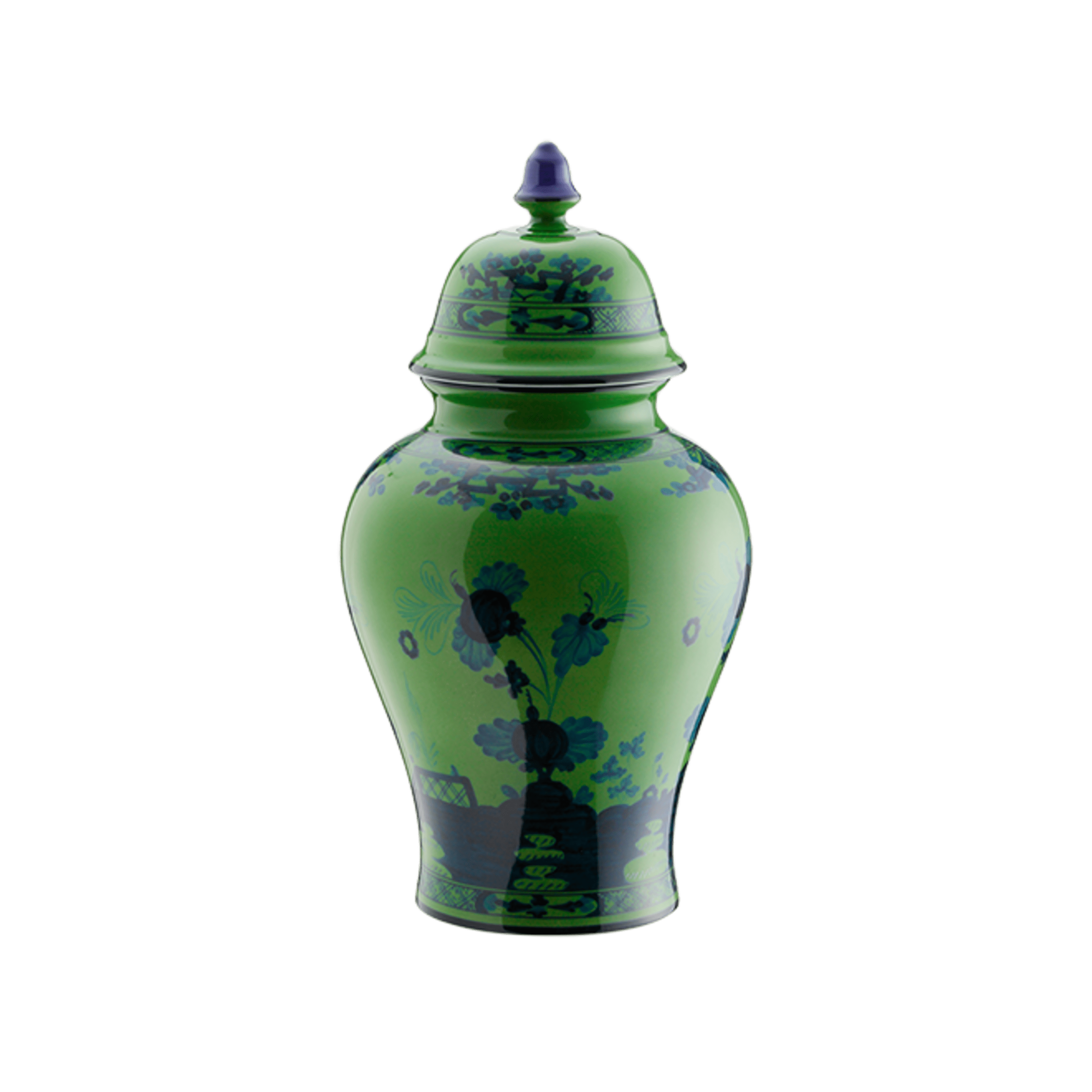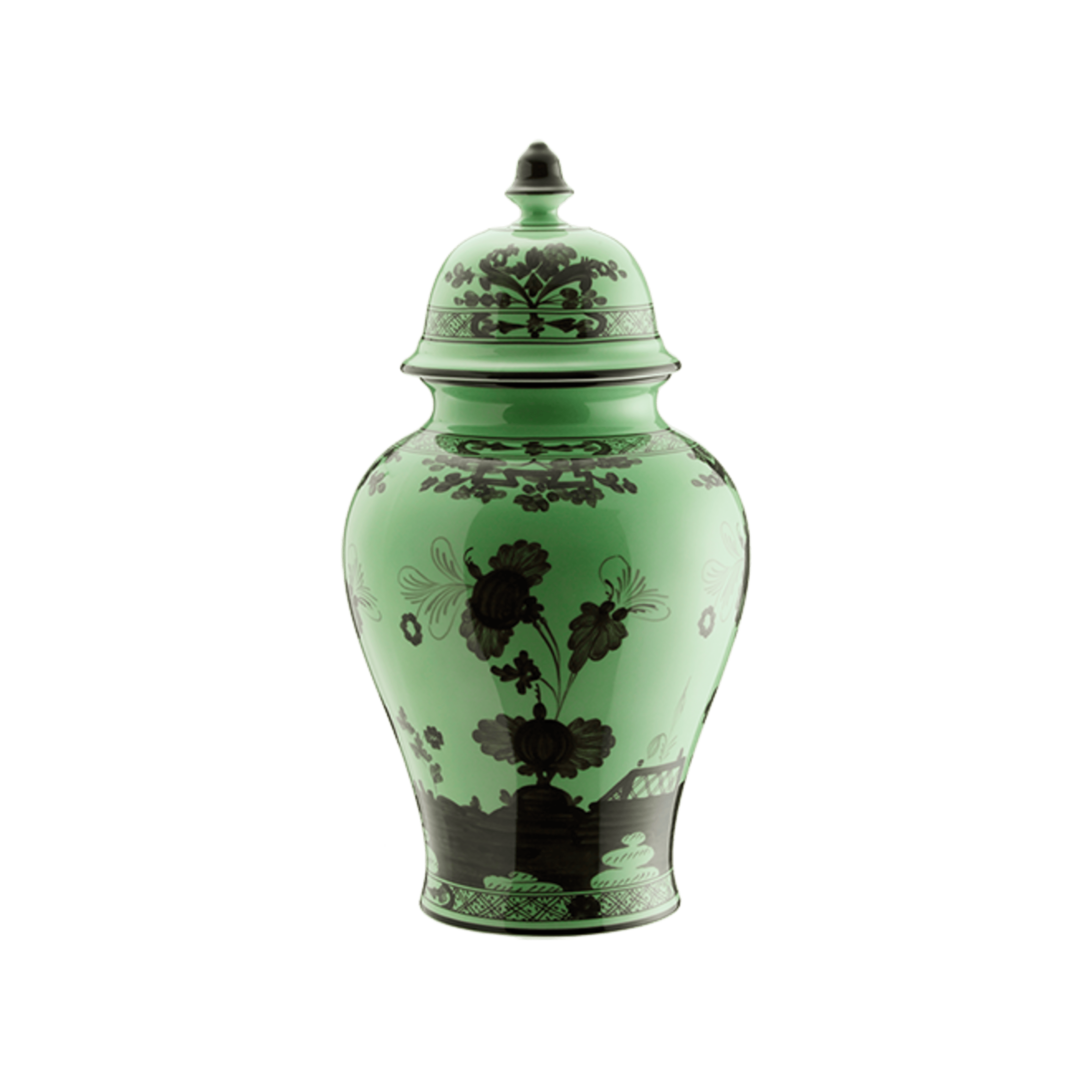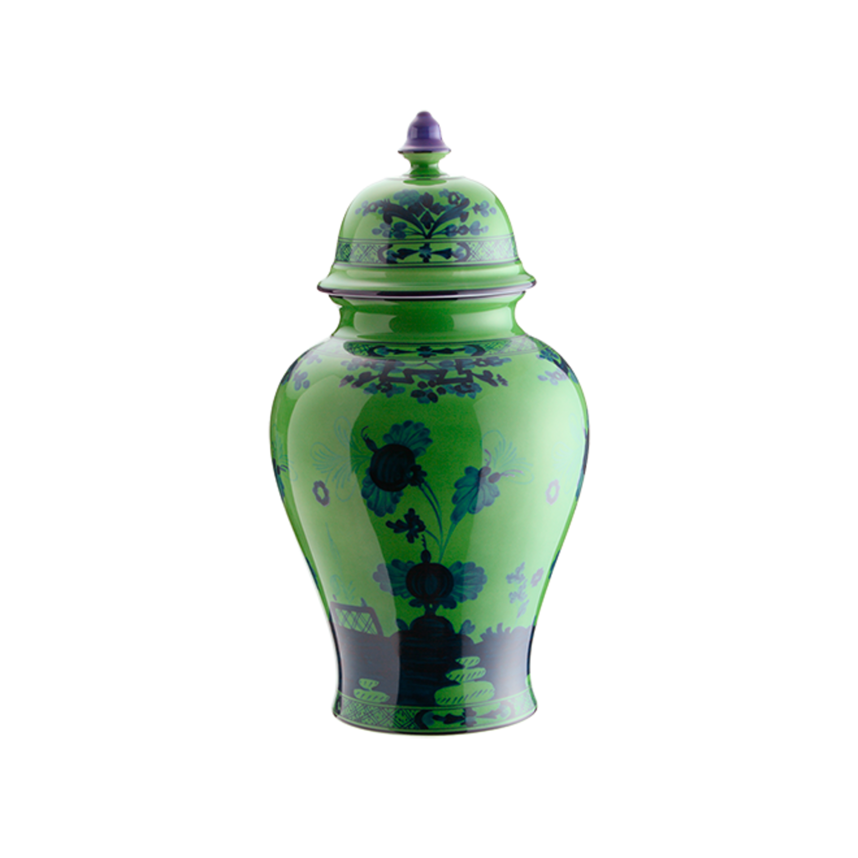 Ginori 1735 Potiche Vase With Cover Oriente Italiano. It is the setting of the Oriente Italiano Collection on the Antico Doccia shape. Enrich your table with the vibrant colors. Choose from an array of 12 unique designs, including Albus (Black on white), Azalea (Light Pink with gold rim), Bario (Light Green), Cipria (Powder), Citrino (Yellow), Iris (Turquoise with gold rim), Malachite (Green), Pervinca (Blue-violet with gold rim), Porpora (Purple with gold rim), and Vermiglio (Red-orange).