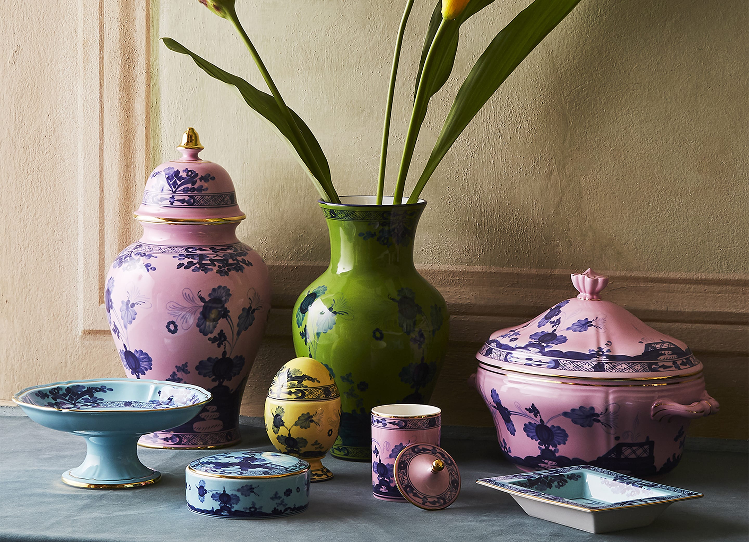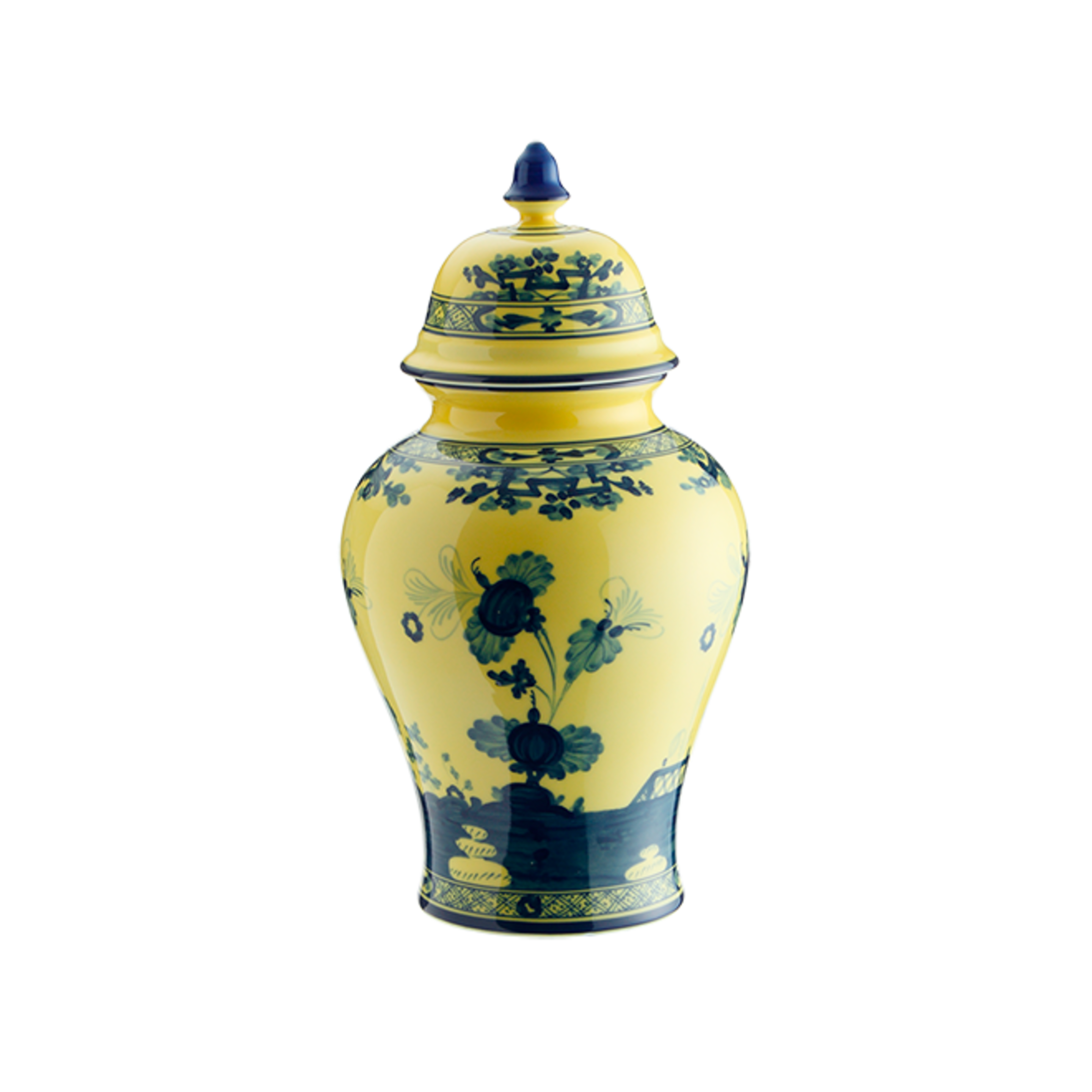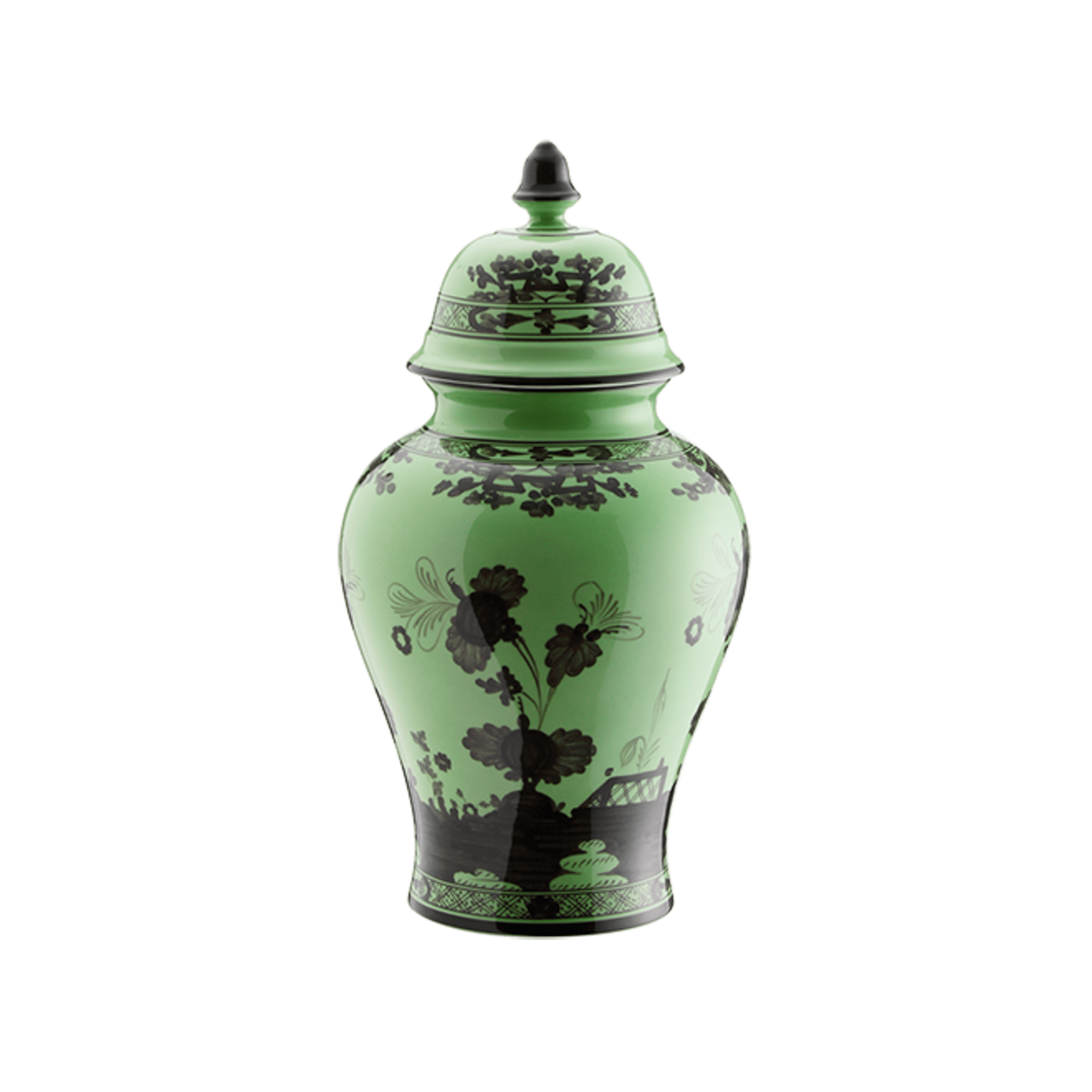 Ginori 1735 Potiche Vase With Cover Oriente Italiano. It is the setting of the Oriente Italiano Collection on the Antico Doccia shape. Enrich your table with the vibrant colors. Choose from an array of 12 unique designs, including Albus (Black on white), Azalea (Light Pink with gold rim), Bario (Light Green), Cipria (Powder), Citrino (Yellow), Iris (Turquoise with gold rim), Malachite (Green), Pervinca (Blue-violet with gold rim), Porpora (Purple with gold rim), and Vermiglio (Red-orange).