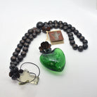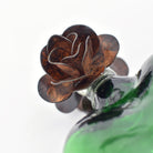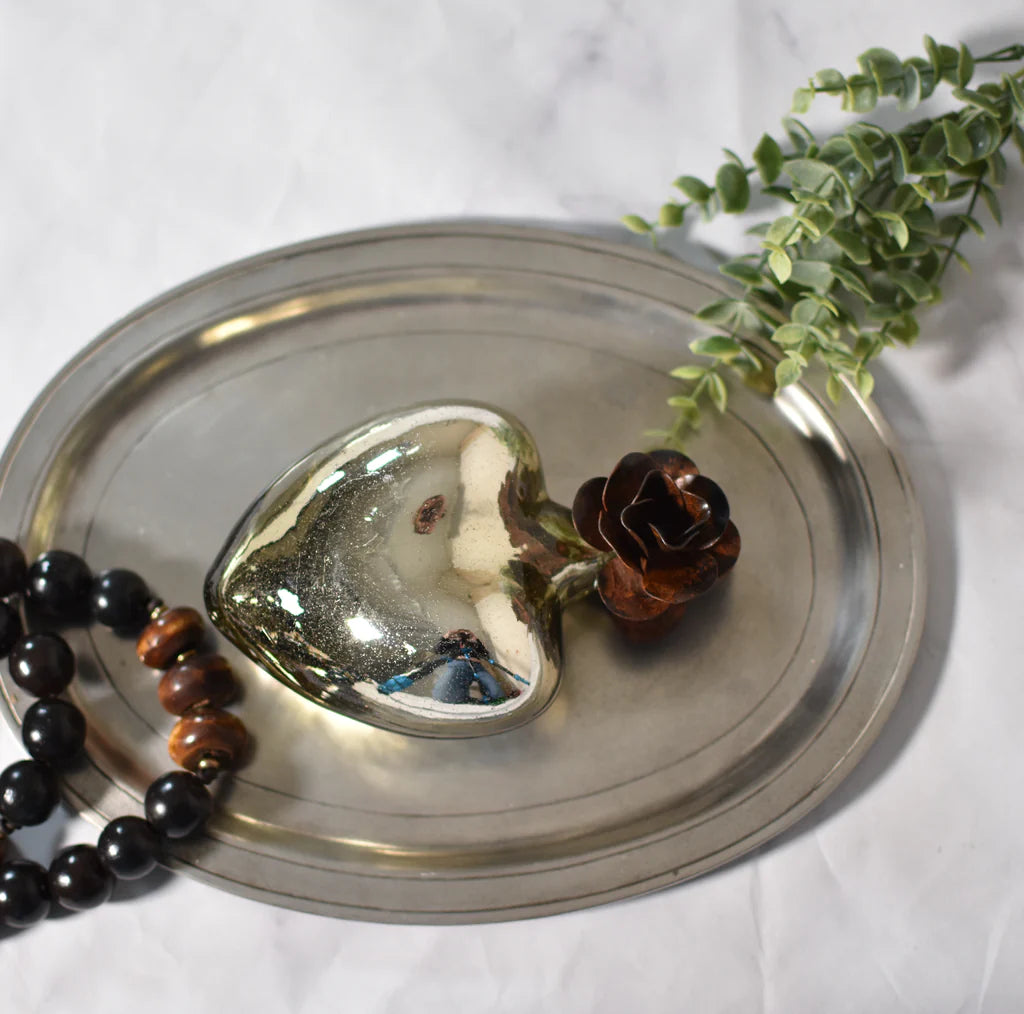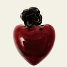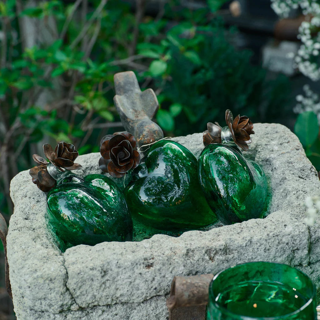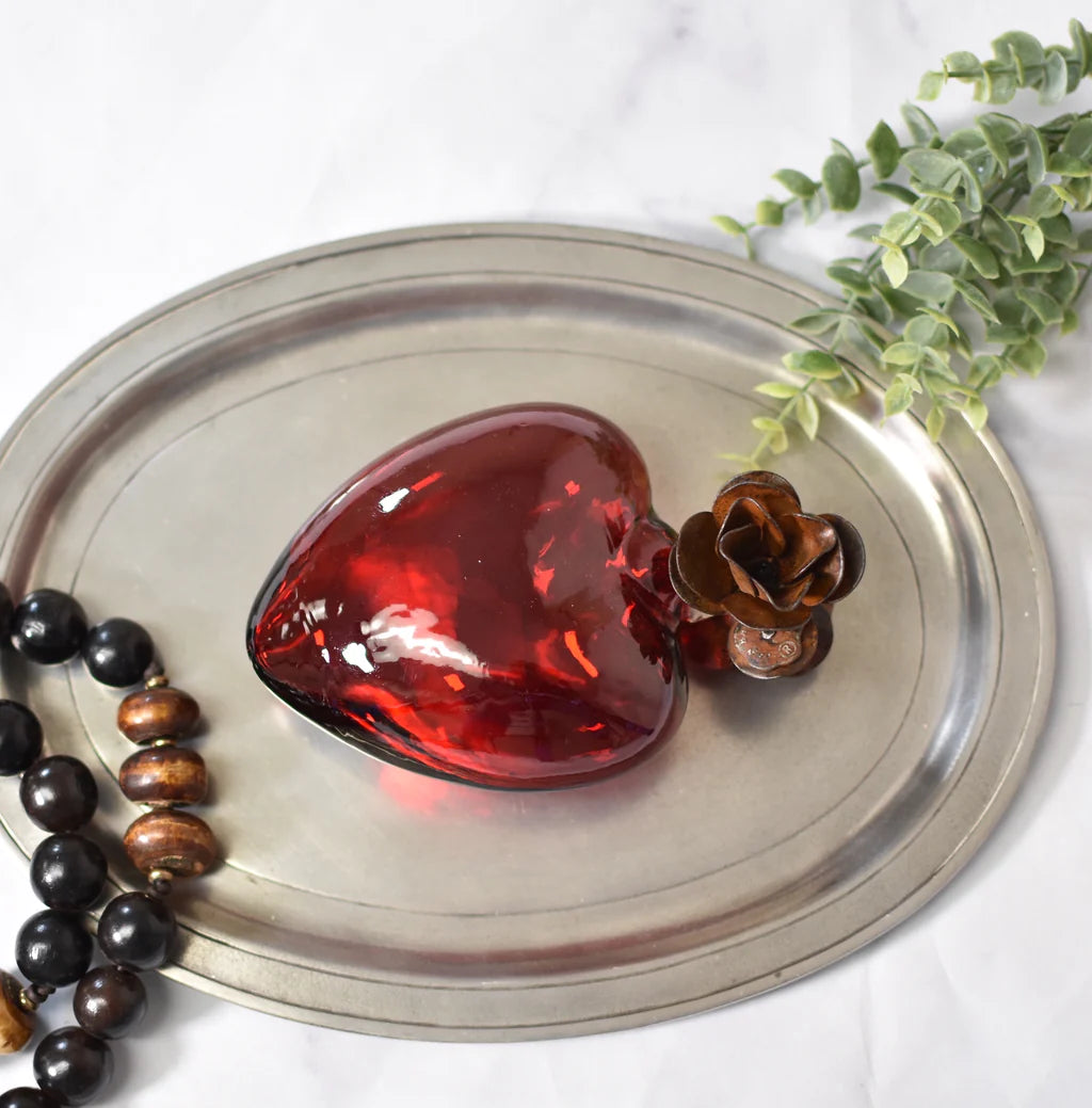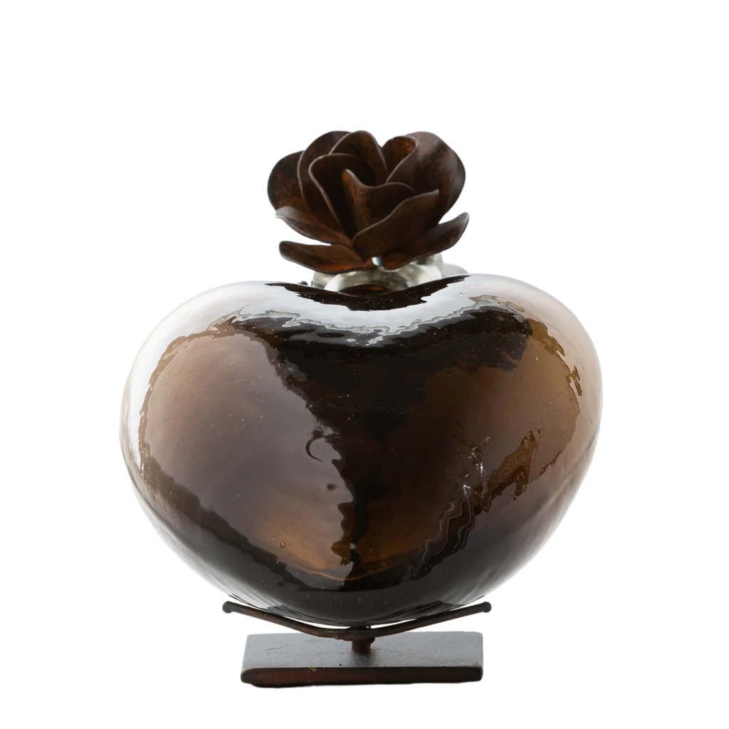 Corazon d'Melon Mouth blown sumptuous Chocolate glass heart with an iron rose . . . add to a place setting for a dinner for two . . . a symbol of the sweetness of love . . . Rojo Mouthblown glass heart the color of passion . . . finished with a perfectly crafted iron rose. Platinum Mouth blown puffed glass heart with platinum finish and tiny iron rose. Verde passion Mouthblown glass heart with tiny rose.