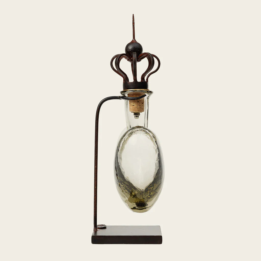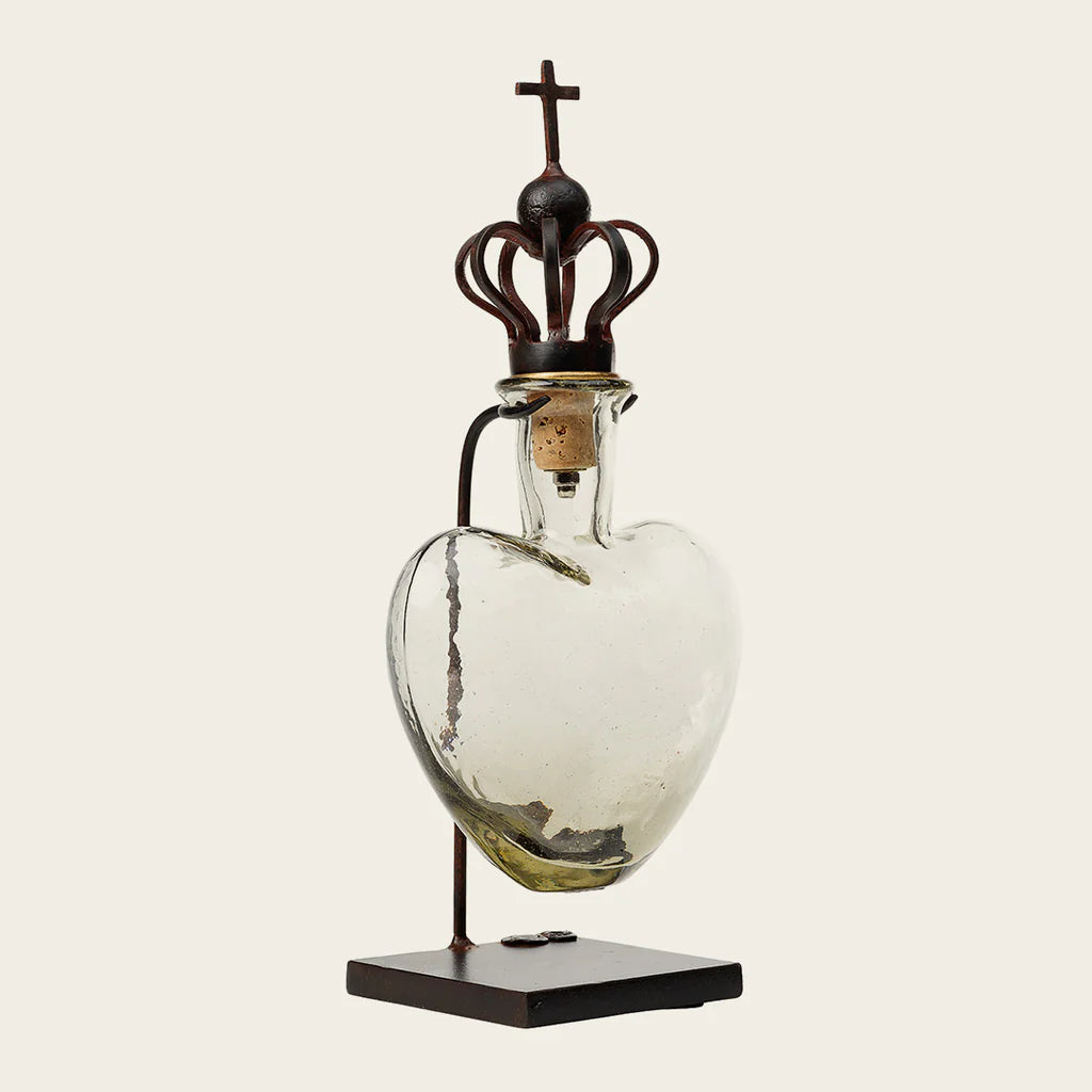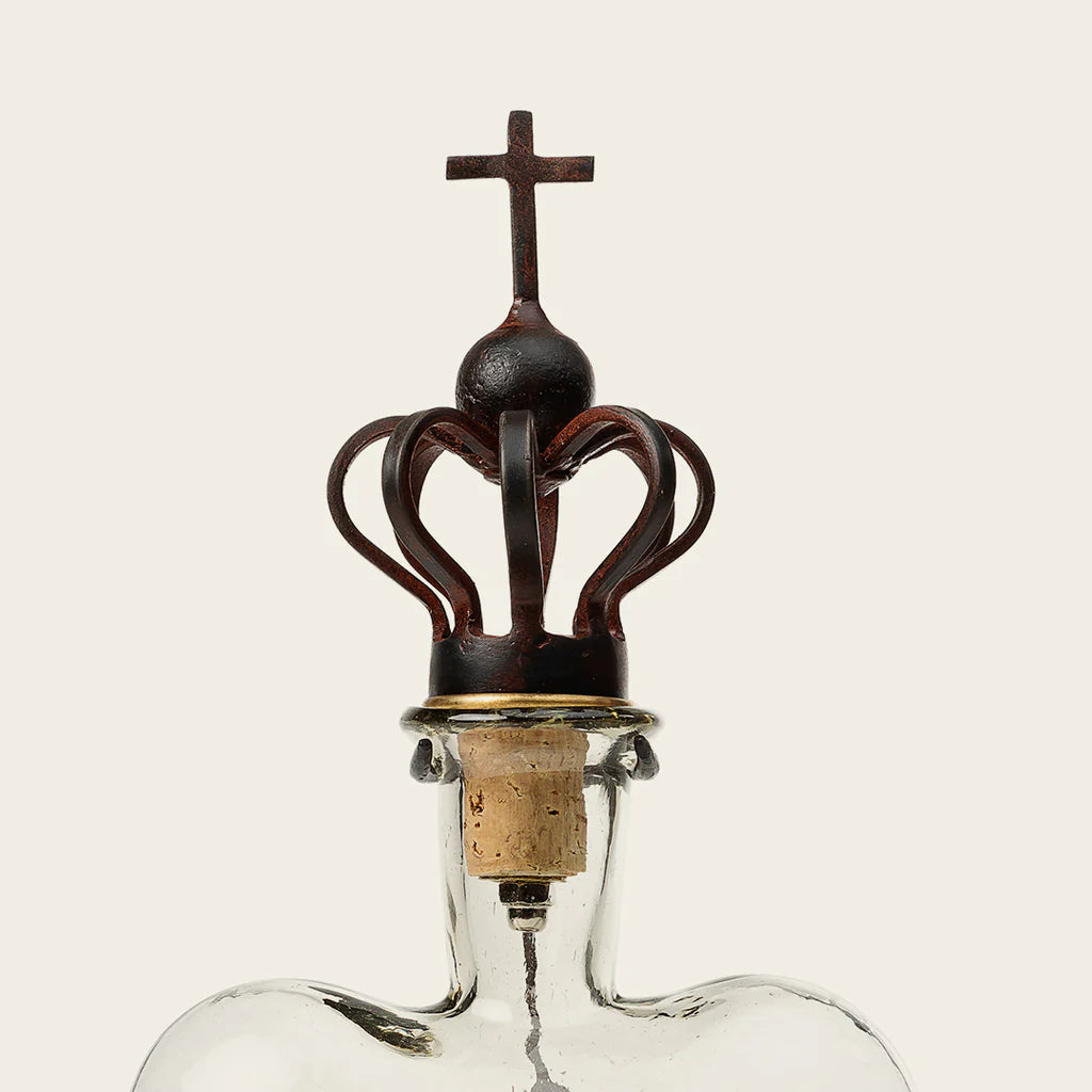 Immerse your home in sophistication with the Crowned Heart Decanter. Crafted from clear mouth-blown glass, this decanter features a striking heart-shaped design, symbolizing both love and elegance. The decanter is topped with a meticulously crafted crown stopper, adding a regal touch that enhances its visual appeal. Mounted on a polished museum stand, the decanter is not just a functional item but also a statement piece that complements any decor.