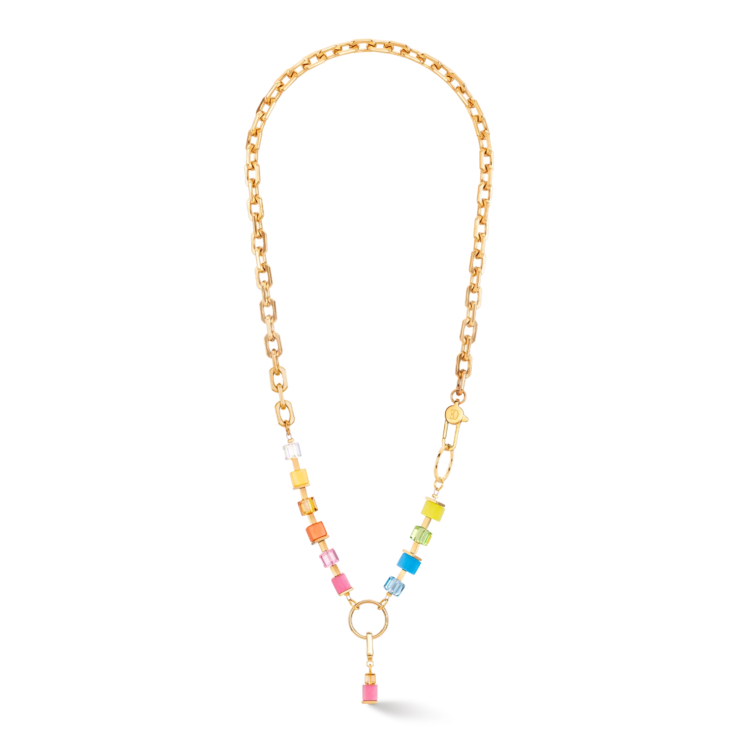 Discover a new cube look with the Cube Fusion Charm necklace gold-rainbow, combined with a shiny golden stainless steel chain. This necklace once again offers multi-wear options. Let your creativity run wild and discover countless ways to wear it. The chain can be hooked into the chain links as desired, the charm and the 4-cube element can be removed and reintegrated elsewhere. The chain can be worn short, long or as a Y-variant. If you prefer to wear an XXL chain, you can attach the bracelet to the chain as usual to extend it.