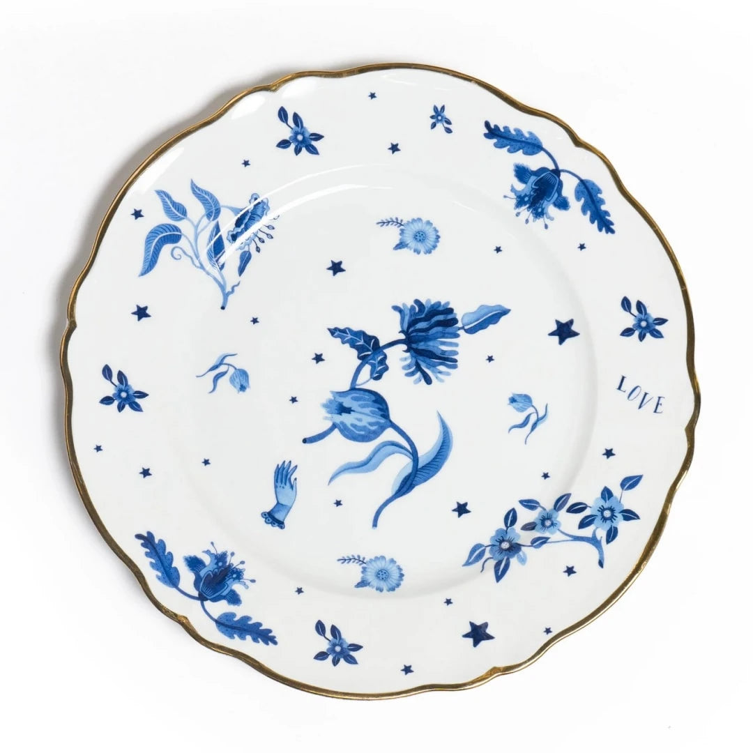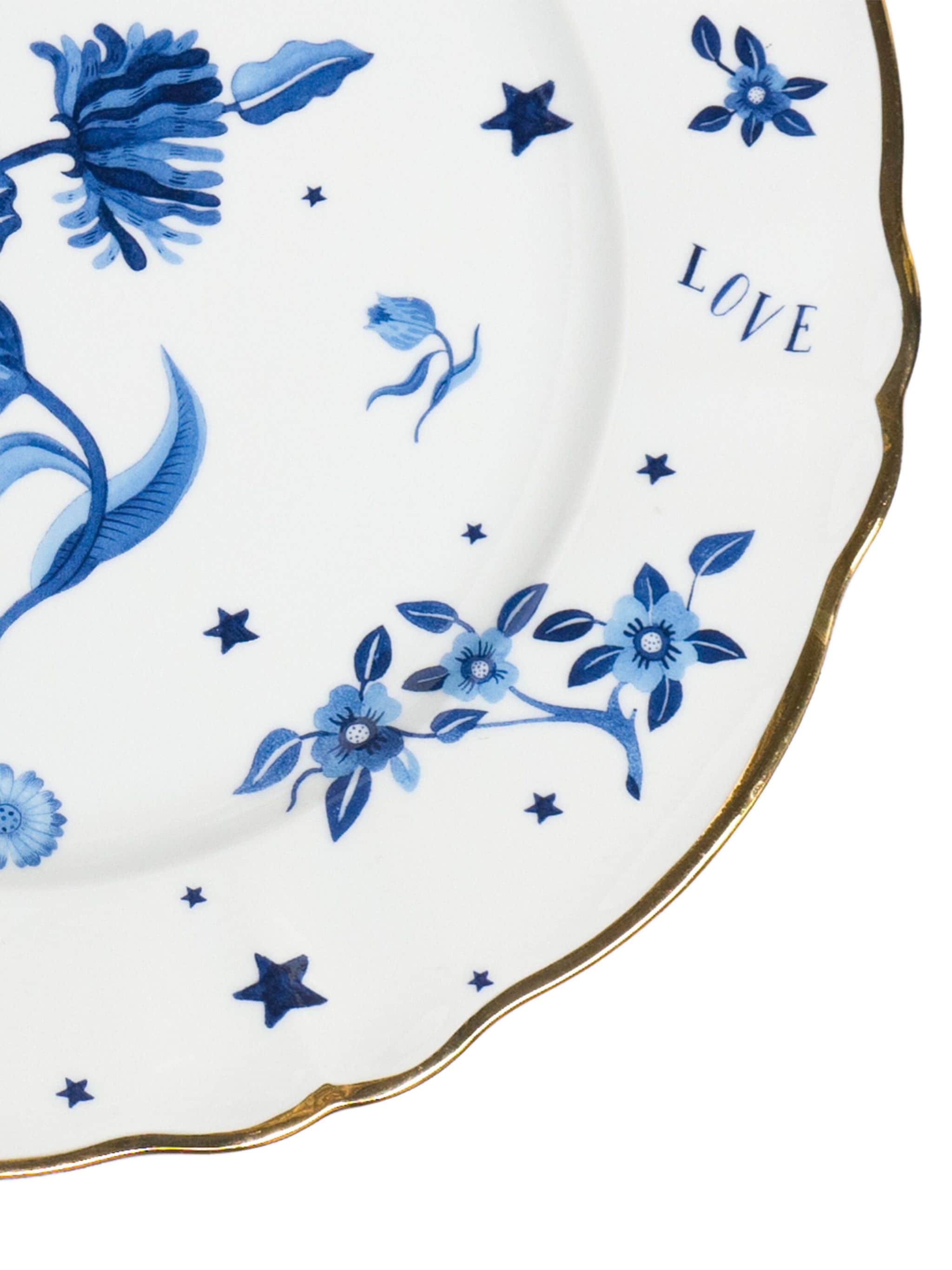 - Color/Finish: Ivory White and Royal Blue Hues, with Gold Rim