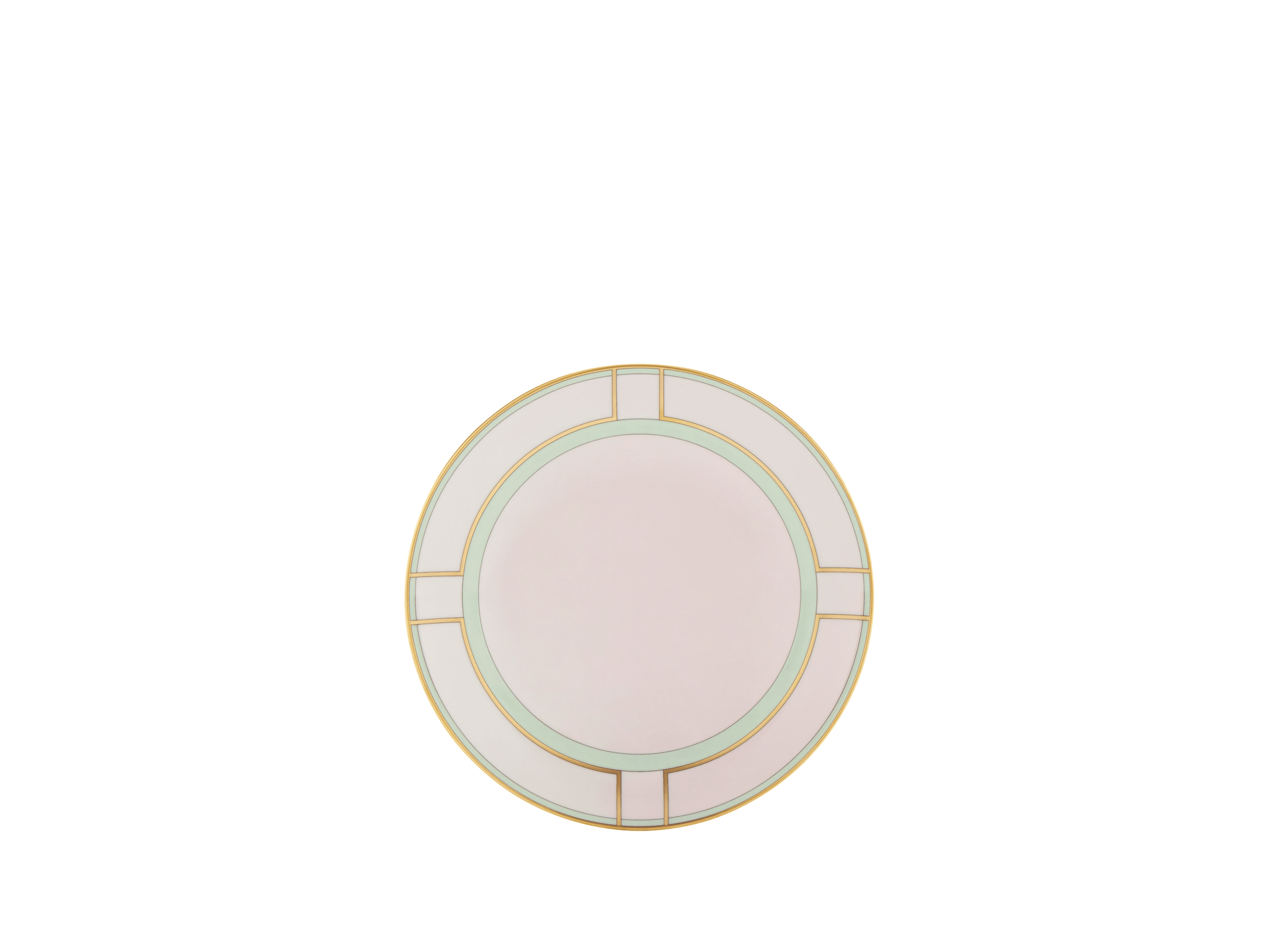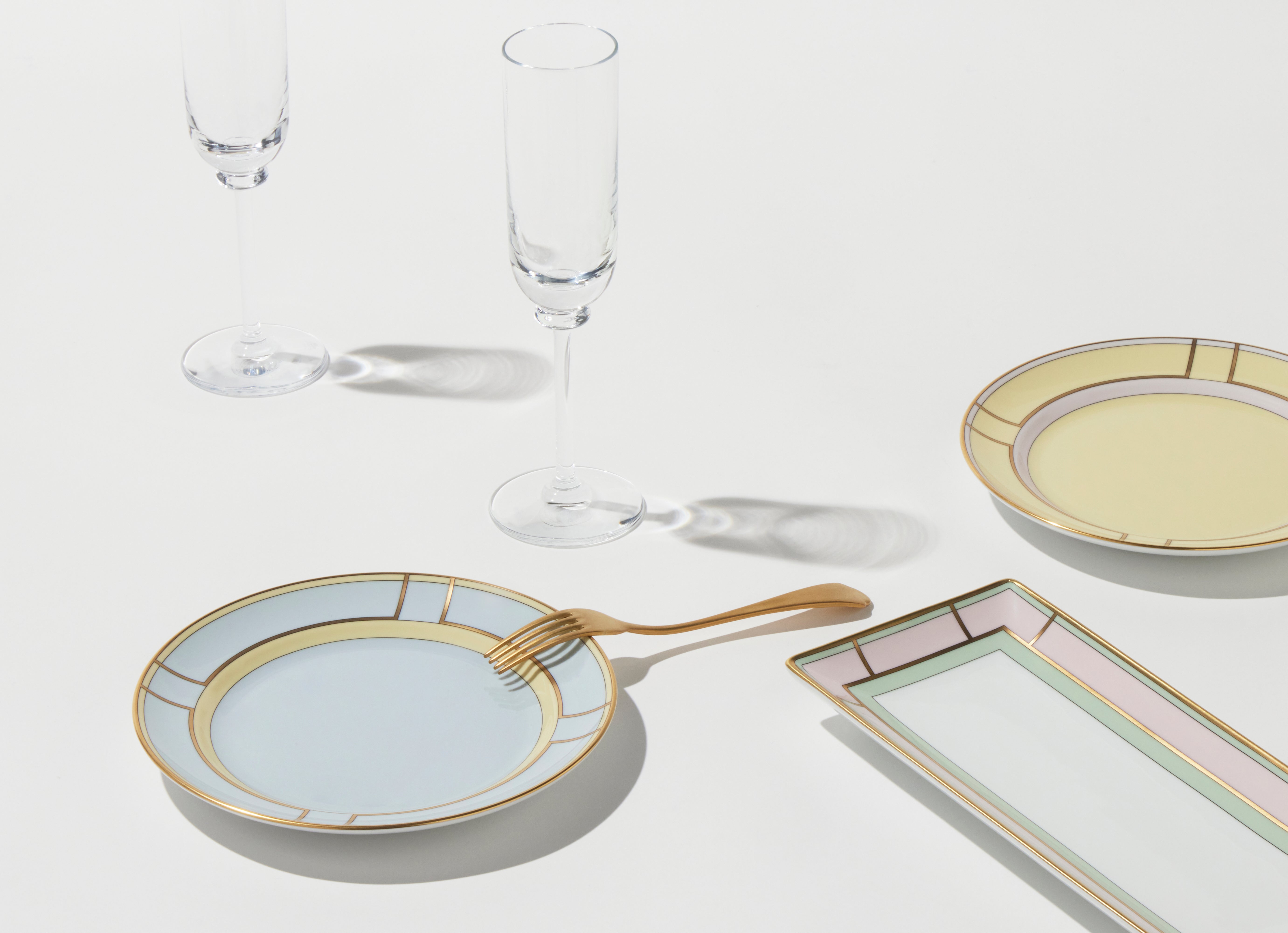 Fine porcelain decorated with a pastel motif and embellished with gold threading. They complement the soup, bread and dessert plates from the same collection for a complete service that is stackable and can be tucked away into small spaces. The shapes take inspiration from Colonna, an iconic mid-1950s collection by designer Giovanni Gariboldi and an emblem of functionality and modernism.