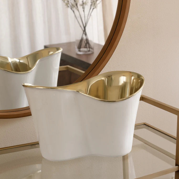 Elevate your entertaining with the luxurious THANNI Double Ice Bucket by Beatriz Ball, a striking fusion of artistry and functionality. This sleek serving piece, part of the stunning THANNI Collection, features a flaring design with dramatic depth and a daring double form, perfect for holding two bottles of wine. The bold contrast between the white enamel and gold-tone metal creates an eye-catching statement on any bar or kitchen island.