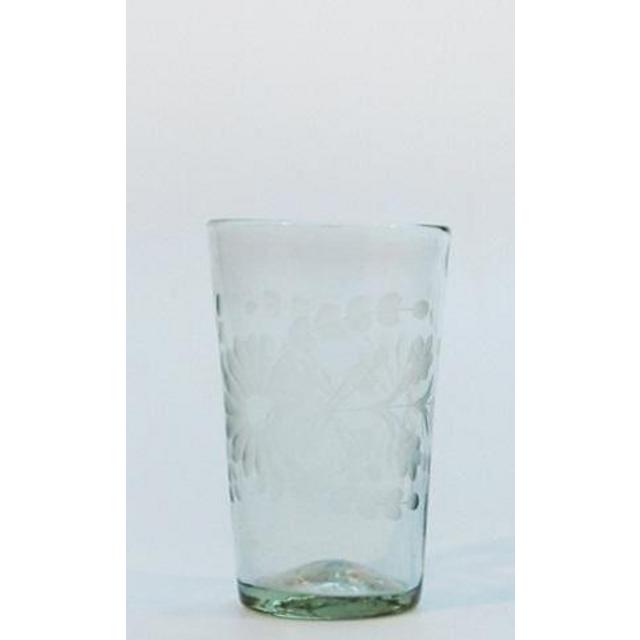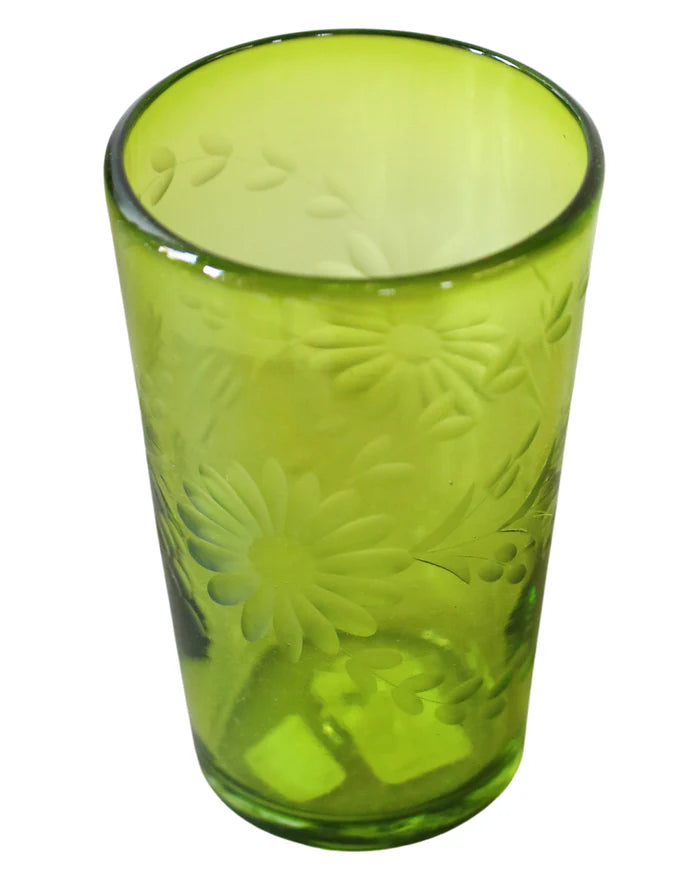 The Condessa Iced Tea Glass in Verde by Rose Ann Hall Designs is a stunning piece of handcrafted artistry. Each glass is meticulously hand-blown by skilled craftsmen in Mexico using recycled glass, making every piece unique and environmentally friendly. The elegant design is achieved through traditional techniques, where maestros engrave intricate patterns directly onto the glass using only a grinding stone and their experienced eye.