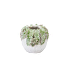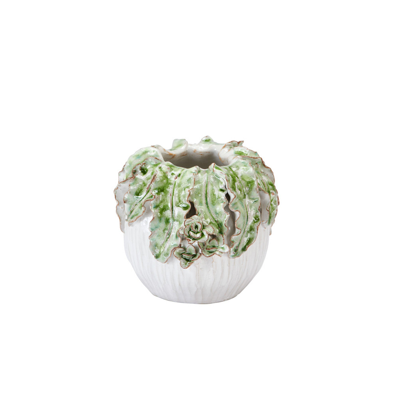 One-of-a-kind handmade Thai ceramic vase stands out with its beautifully intricate design. Measuring 4.75" tall and 6" wide, it features a white textured base, topped with cascading green leaf details and a subtle succulent accent. The organic, nature-inspired elements add a refreshing, artistic flair, making it a captivating statement piece for any space. Perfect as a decorative vase or a standalone art piece.