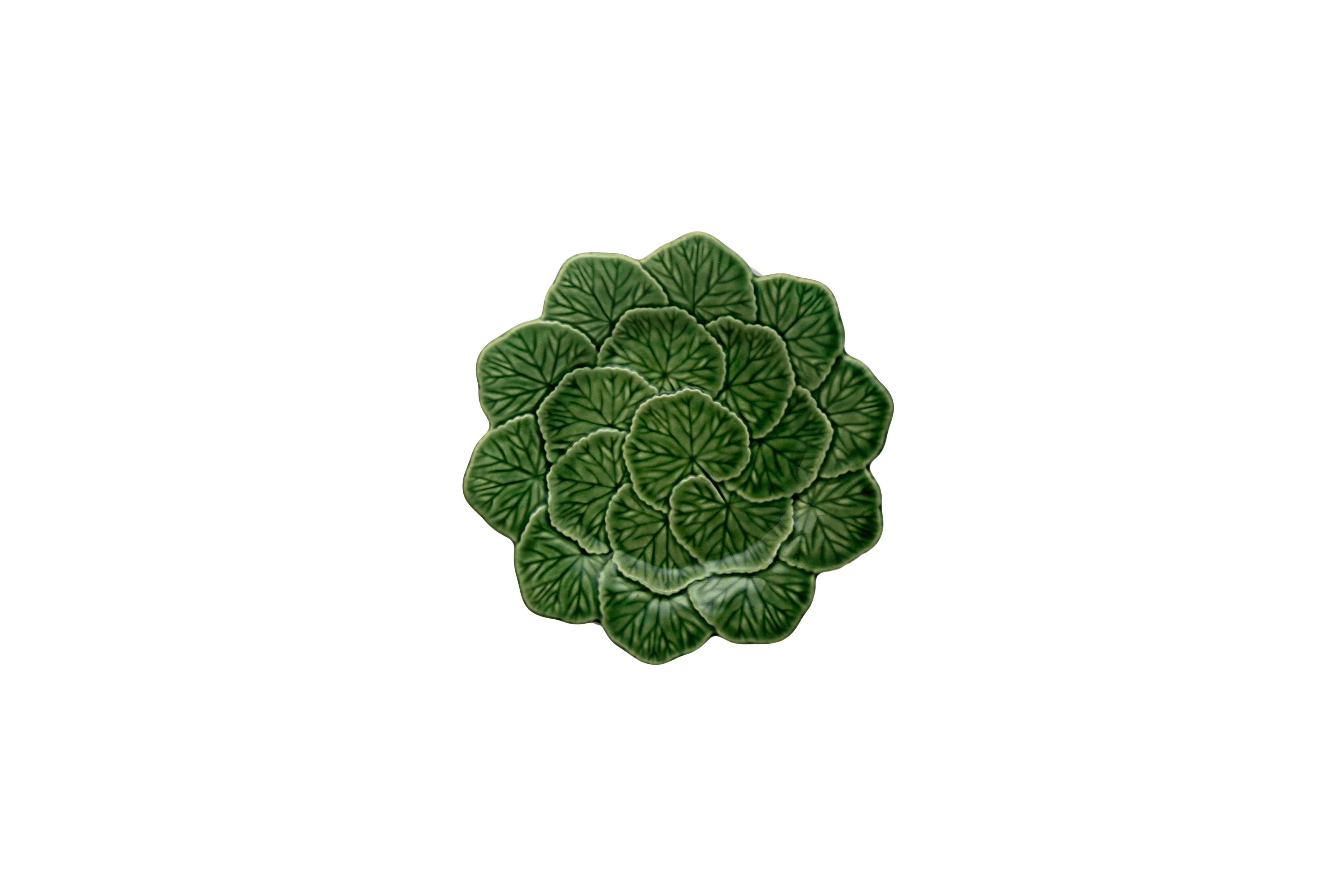 The Bordallo Pinheiro Geranium Fruit Plate is a remarkable example of Portuguese ceramic artistry, designed to celebrate the freshness and vibrancy of the natural world. Inspired by the graceful form of the geranium leaf, this piece captures the leaf’s fluid curves and subtle textures, finished in a rich green glaze with delicate white accents that bring depth and dimension to the design. Each plate is handcrafted from durable earthenware, carrying forward the legacy of Rafael Bordallo Pinheiro, whose work has long blended whimsical creativity with timeless craftsmanship.