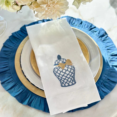 Elevate everyday moments with the timeless charm of the Ginger Jar Linen Tea Towel from Arte Italica. Made from luxurious 100% linen, this elegant towel showcases a beautifully embroidered ginger jar in striking blue and gold threadwork—an homage to classic chinoiserie style. The crisp white linen background enhances the intricate details and provides a sophisticated contrast.