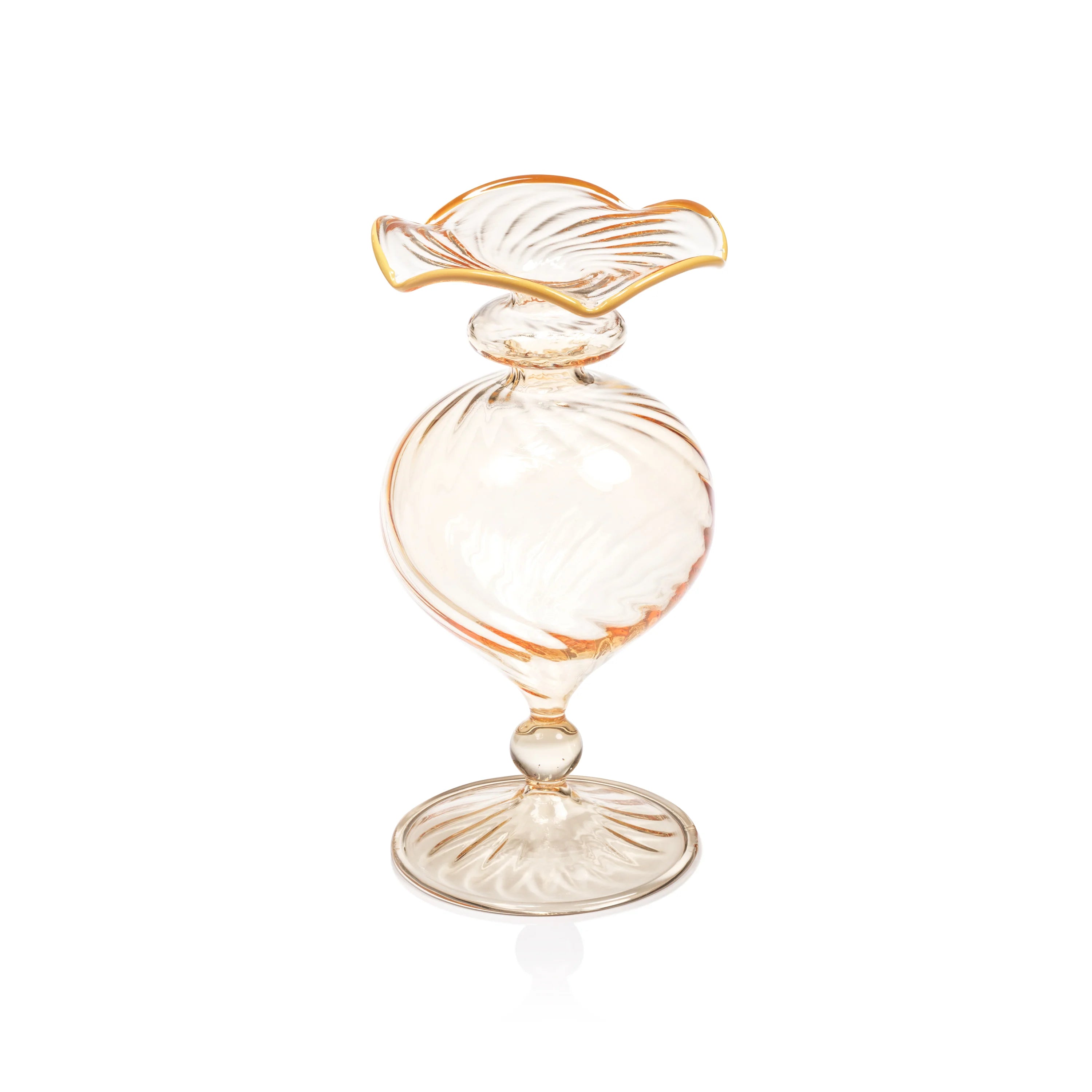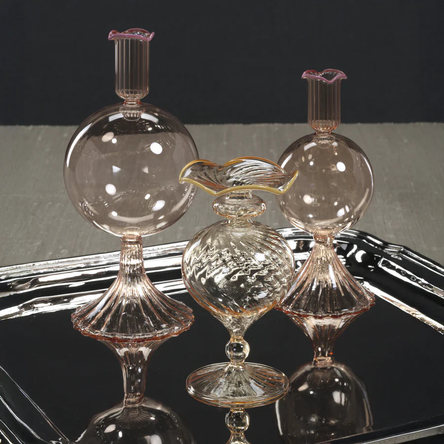 The Treviso Bulb Glass Vase and Treviso Optic Wave Glass Vase with a delicate Peach color rim are exquisite pieces that blend modern elegance with timeless craftsmanship. Made from high-quality borosilicate glass, these vases are lightweight yet durable, offering a refined way to showcase floral arrangements or stand alone as decorative accents.