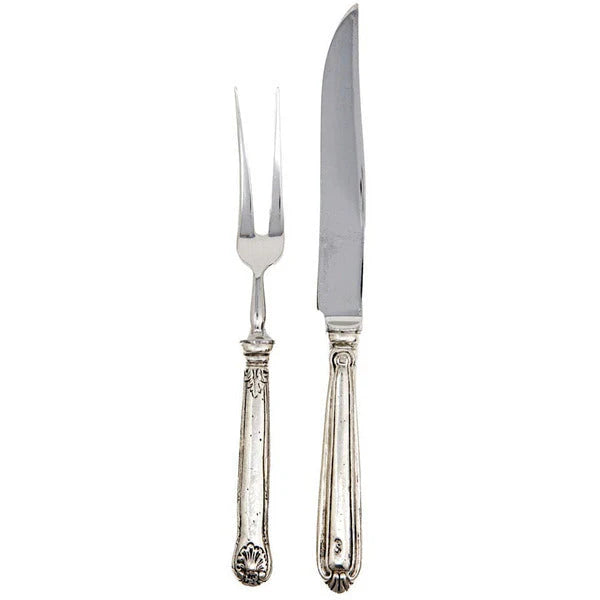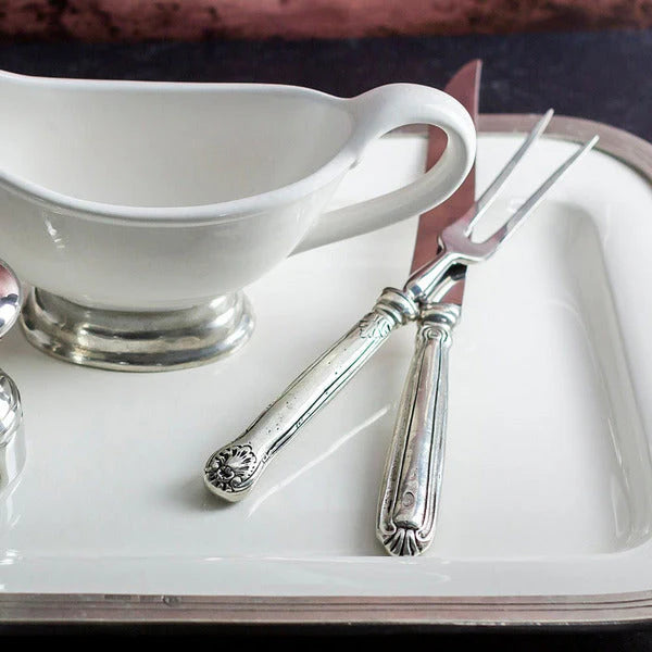 Each piece in the setting has subtle differences in pattern that work beautifully together. The detailing is remarkable, with distinctive stamps on the dinner fork and knife adding an authentic, vintage look. You will also love the weight and feel of them in your hands. A true heirloom collection. Continue the heritage and make your meals memorable with this unique carving set. With vintage details and distinctive stamps, each piece in the set adds character to your table setting. The solid weight and impressive detailing make this set feel like a true heirloom collection. You'll love the classic elegance and charm this carving set brings to your dining experience.
