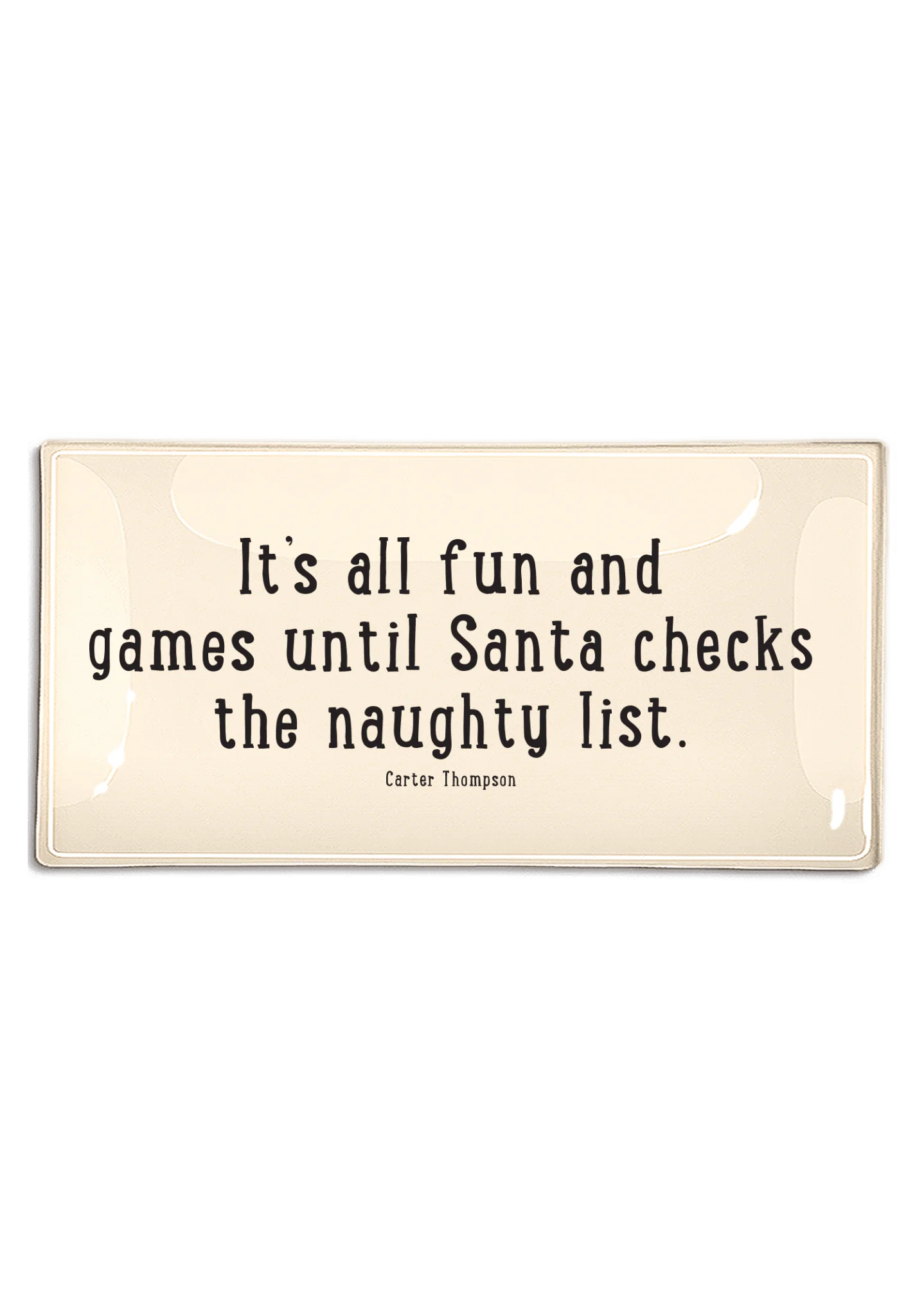 The "It's All Fun and Games Until Santa" Decoupage Glass Tray is a delightful blend of practicality and artistry, perfect for adding a whimsical touch to your holiday decor. Handcrafted in a New York studio, it follows the time-honored French tradition of decoupage, showcasing vintage typeset on a natural cream background. Each tray is individually signed by Ben, adding a personal and distinctive touch to every piece.
