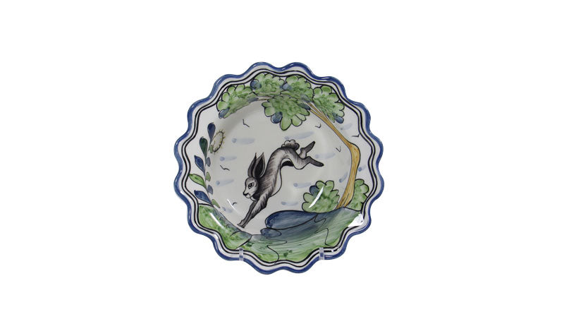 The Le Lapin Cereal Bowl from CE Corey is a beautiful blend of functionality and artistry. Handcrafted and painted in Portugal, this bowl features a charming depiction of a running hare surrounded by soothing hues of blues and greens. Its scalloped edges and intricate design make it a standout piece, whether used for serving or displayed as décor.