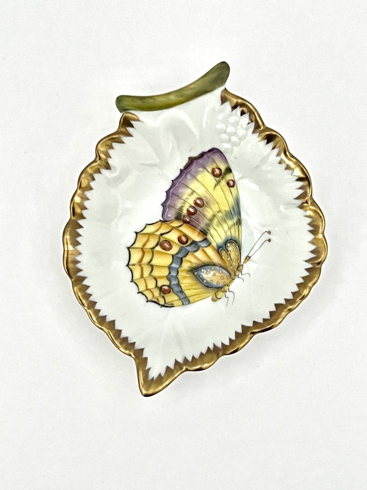 The Anna Weatherley Leaf Dish with Yellow Butterfly is a refined example of hand-painted porcelain artistry, blending elegance with natural inspiration. Crafted in limited quantities, each dish is meticulously painted in Anna Weatherley’s Budapest studio, where skilled artisans bring delicate botanical motifs to life using traditional techniques. The design features a sculpted porcelain leaf adorned with a soft yellow butterfly, rendered with lifelike detail and framed by a shimmering gold border that adds a touch of luxury.