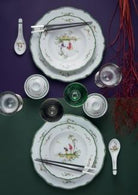 The Longjiang Dinner Plate No. 1, part of the Raynaud Dinnerware collection, is a beautifully crafted piece of fine porcelain dinnerware. The Longjiang dinnerware is inspired by the paintings of Jean Pillement, a renowned Rococo painter. Each piece of this Limoges porcelain service is handcrafted, featuring a pattern composed of six motifs. These motifs are painted in lush colors with a green trim and depict Chinese country scenes from the 18th century.