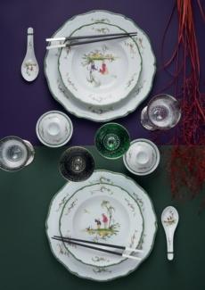 Raynaud Longjiang has replaced the iconic Si King pattern on this dinner plate with a smooth scalloped shape, omitting the embossed wicker texturing.