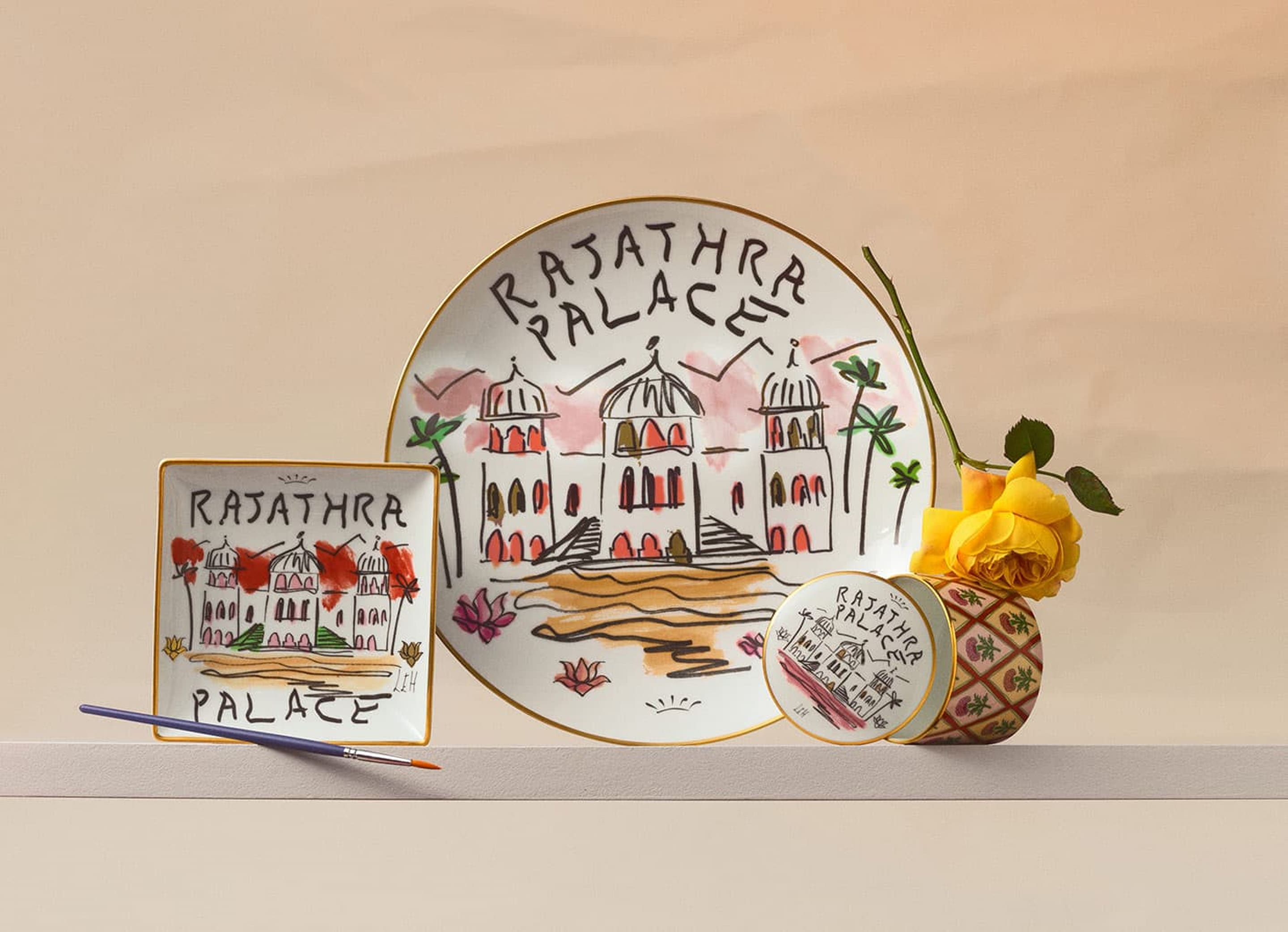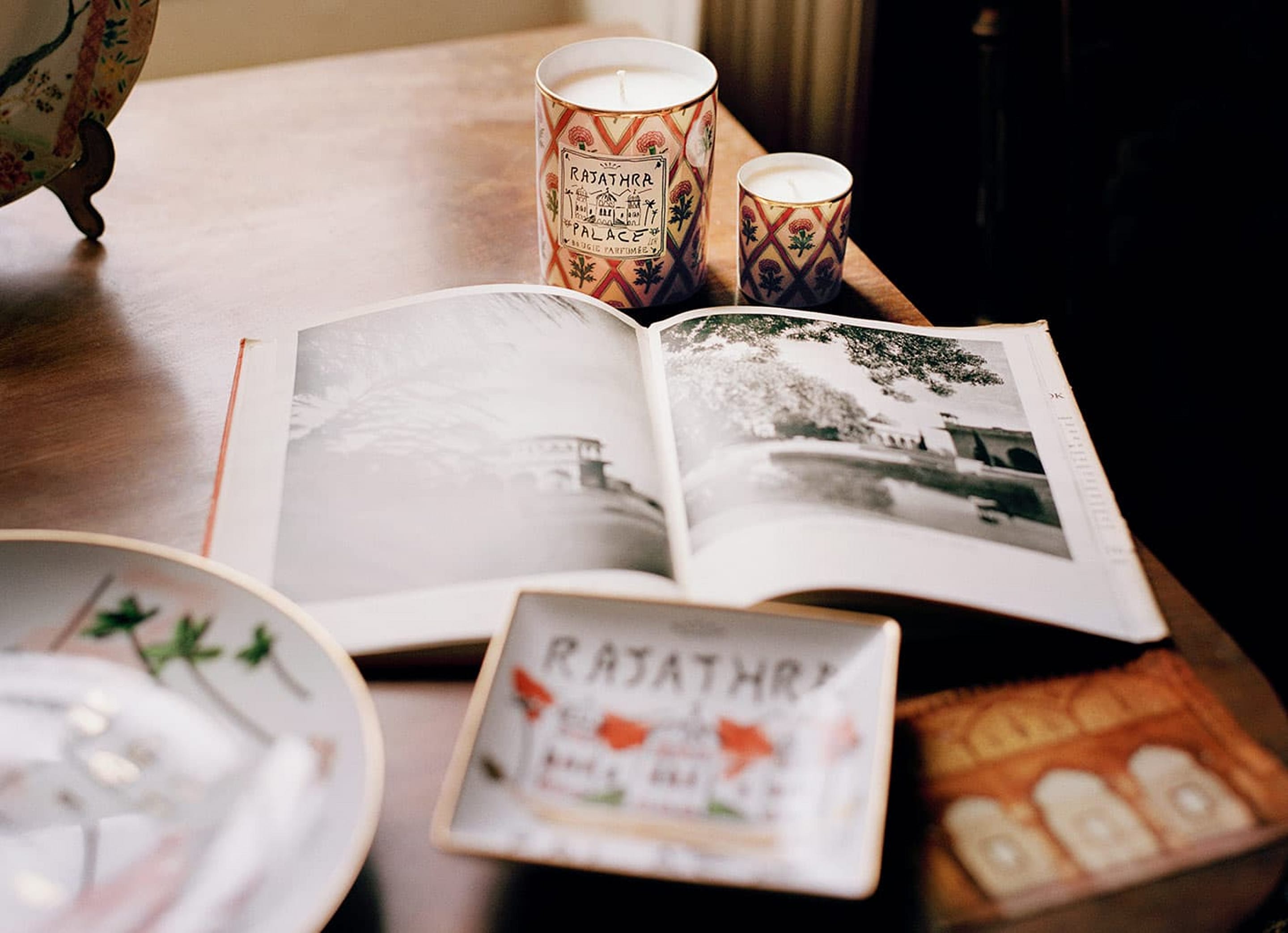 Rajathra Palace (FLORAL, SPICY) Step into the world of the Rajathra Palace in Rajasthan, a memory that resonates with the artist. Despite the palace's closure, its marble rooms and legendary rose gardens continue to be cared for. The design captures the essence of this majestic place.
