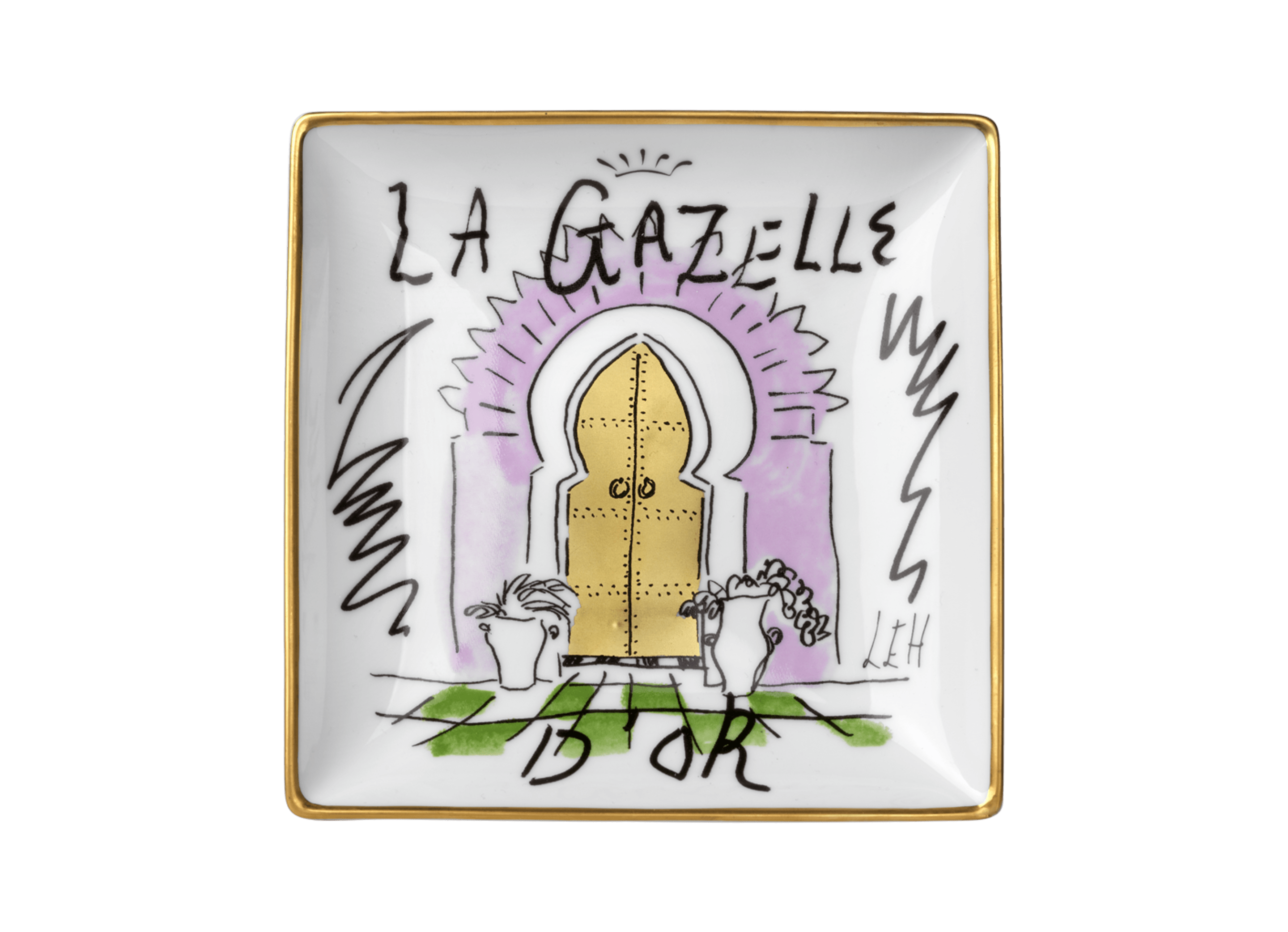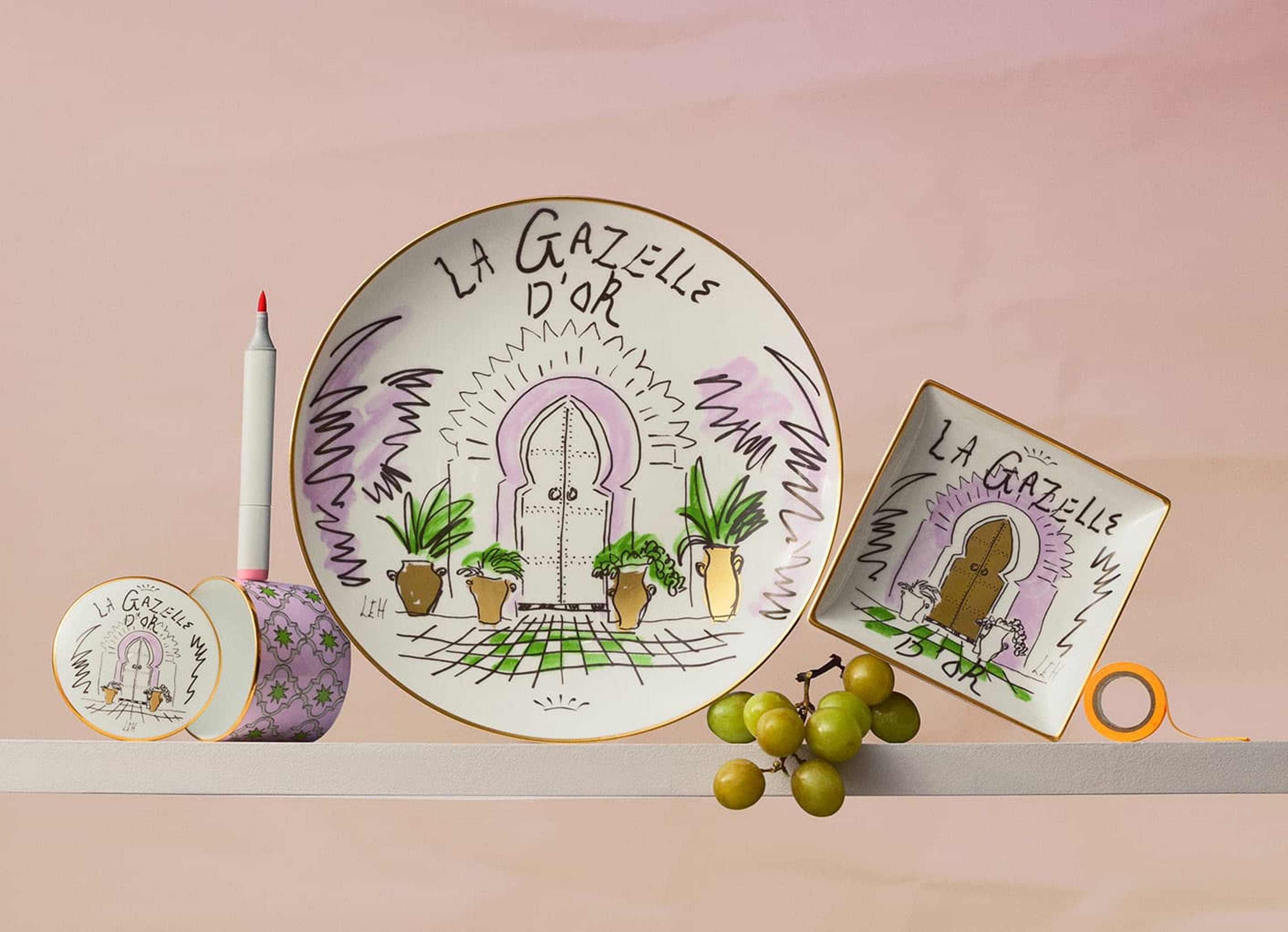 La Gazelle d'Or (FLORAL, HERBAL) Immerse yourself in the medina's labyrinthine streets, where soft pink and blue shadows create hallucinatory experiences. This design, inspired by La Gazelle d'Or in Marrakech, is an artistic representation of the journey to Morocco, a favorite destination of the artist.