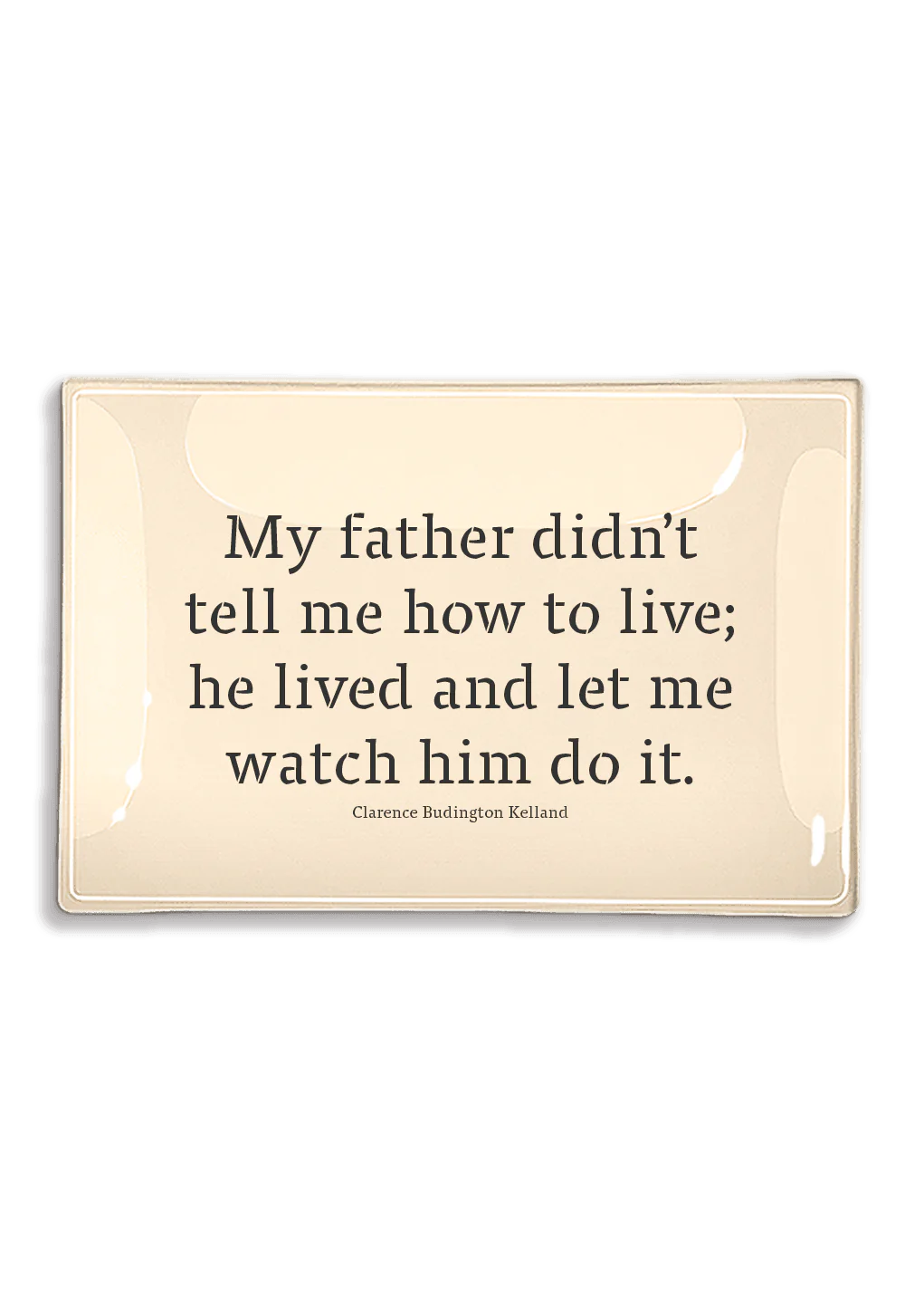 Introducing the "My Father Didn't Tell Me" Decoupage Glass Tray, a beautifully handcrafted piece from our New York studio that reflects the timeless elegance of French decoupage. Featuring vintage typeset on a natural cream background, this tray is individually signed by the artist, Ben, making each one unique.