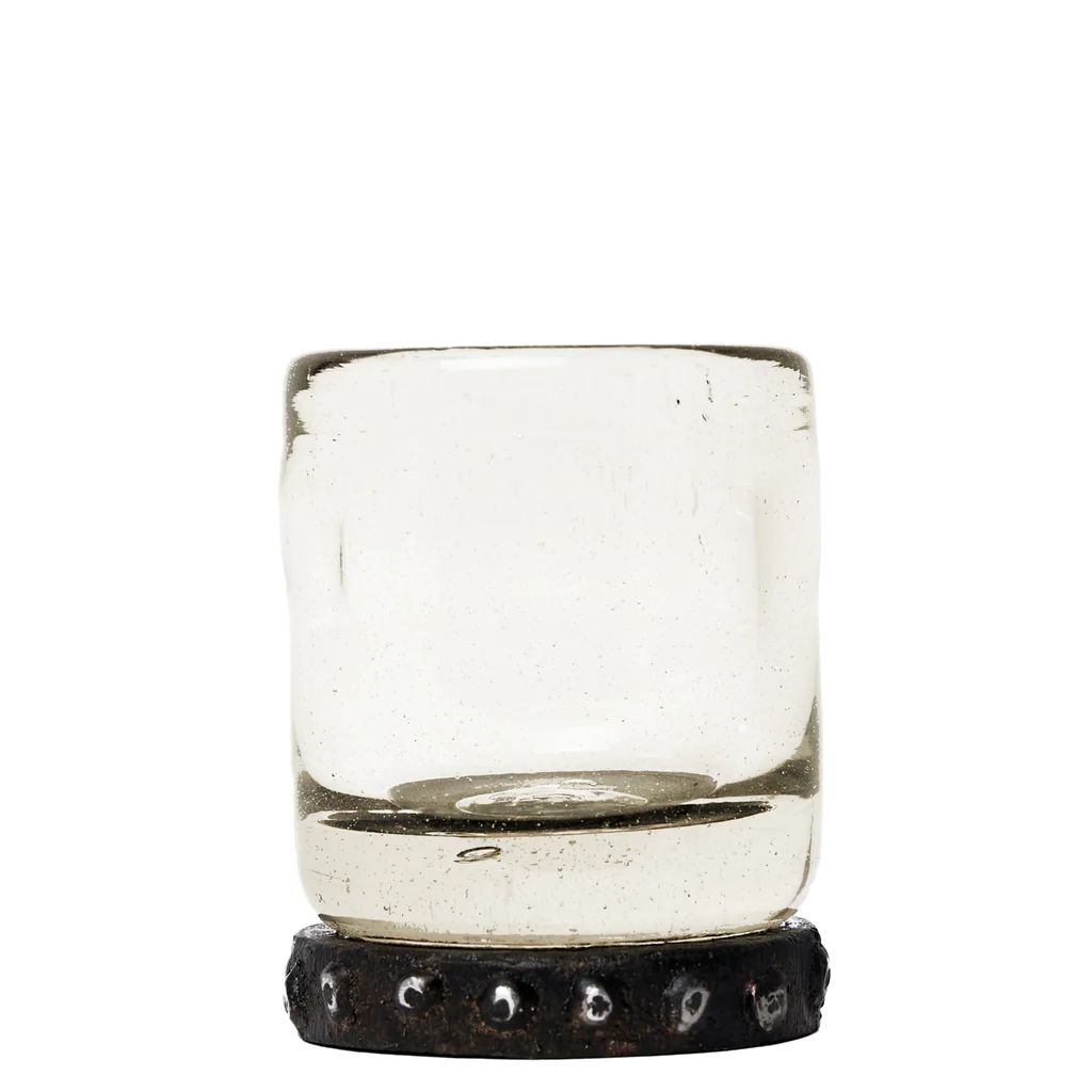 Elevate your drinking experience with PAPACITO ZACK SHOT GLASS. Meticulously handcrafted with wax cast iron and embellished with intricate beading, it's a must-have for the Zackshot collection. These hand-blown glasses, elegantly displayed on iron stands, offer a flawless grip for your pleasure.