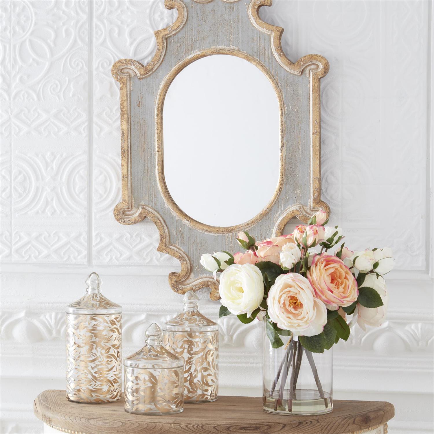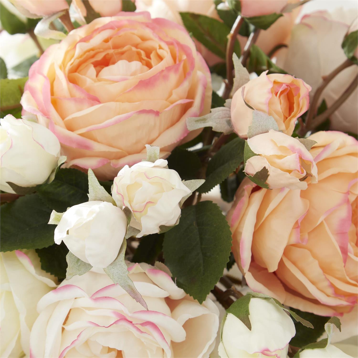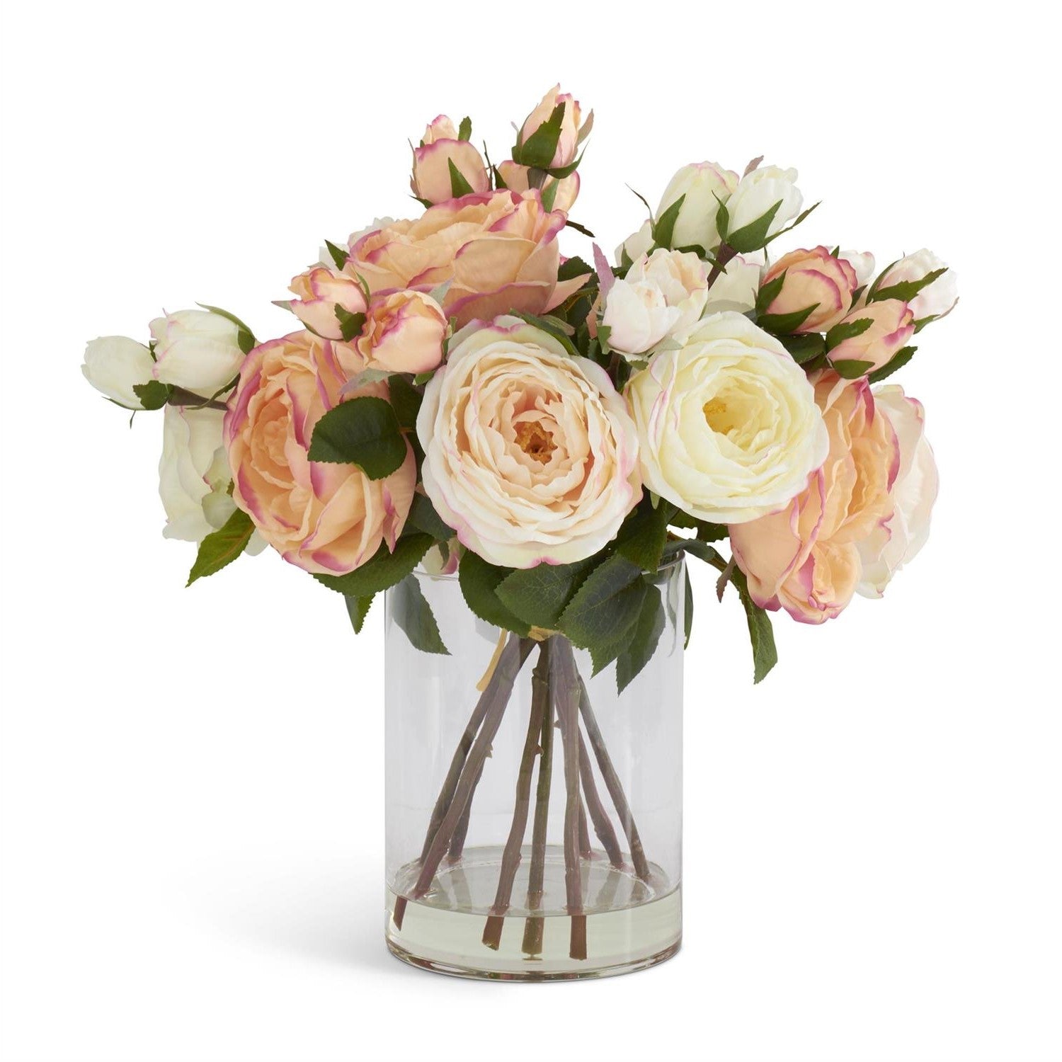 Enhance your space with the timeless beauty of Austin roses by adorning it with this expertly crafted 14-inch premade arrangement. Delicately arranged in a glass vase with faux water, these fresh pink and white roses exude elegance and sophistication, making it the perfect choice for any upscale event or tasteful home décor. With its lifelike appearance and quality materials, this luxurious piece captures the essence of Austin roses without any maintenance required. The ideal centerpiece or thoughtful gift, this arrangement is a must-have for anyone looking to add natural beauty to their space without the worry of wilting. Pamper yourself or a loved one with this premium, handcrafted floral piece that will be cherished for years to come.- Pink & White Austin Rose Premade in Glass Vase