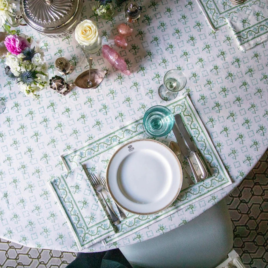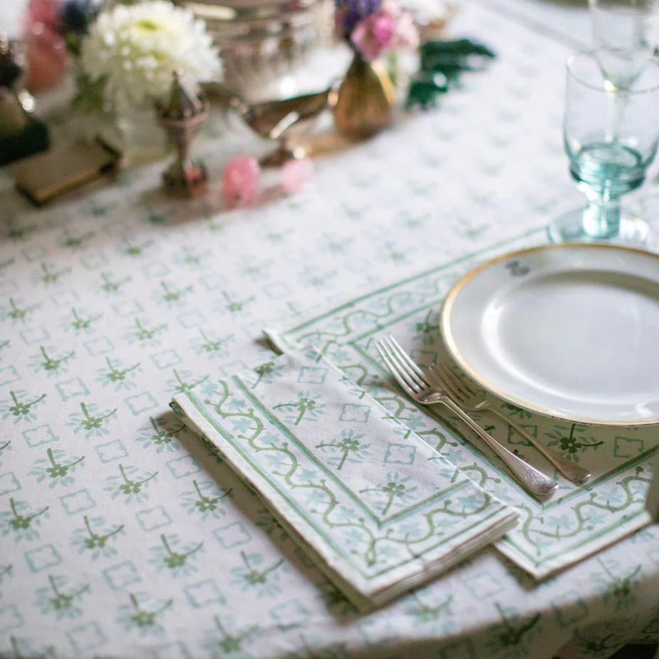 Now hand block printed by skilled artisans in India, the delicate floral pattern is beautifully reimagined in gentle shades of Palladian Blue and Soft Sage. The result is a serene and graceful tablecloth that evokes a sense of coastal sophistication and island charm, while also carrying a deeper narrative rooted in travel, discovery, and the preservation of design heritage.