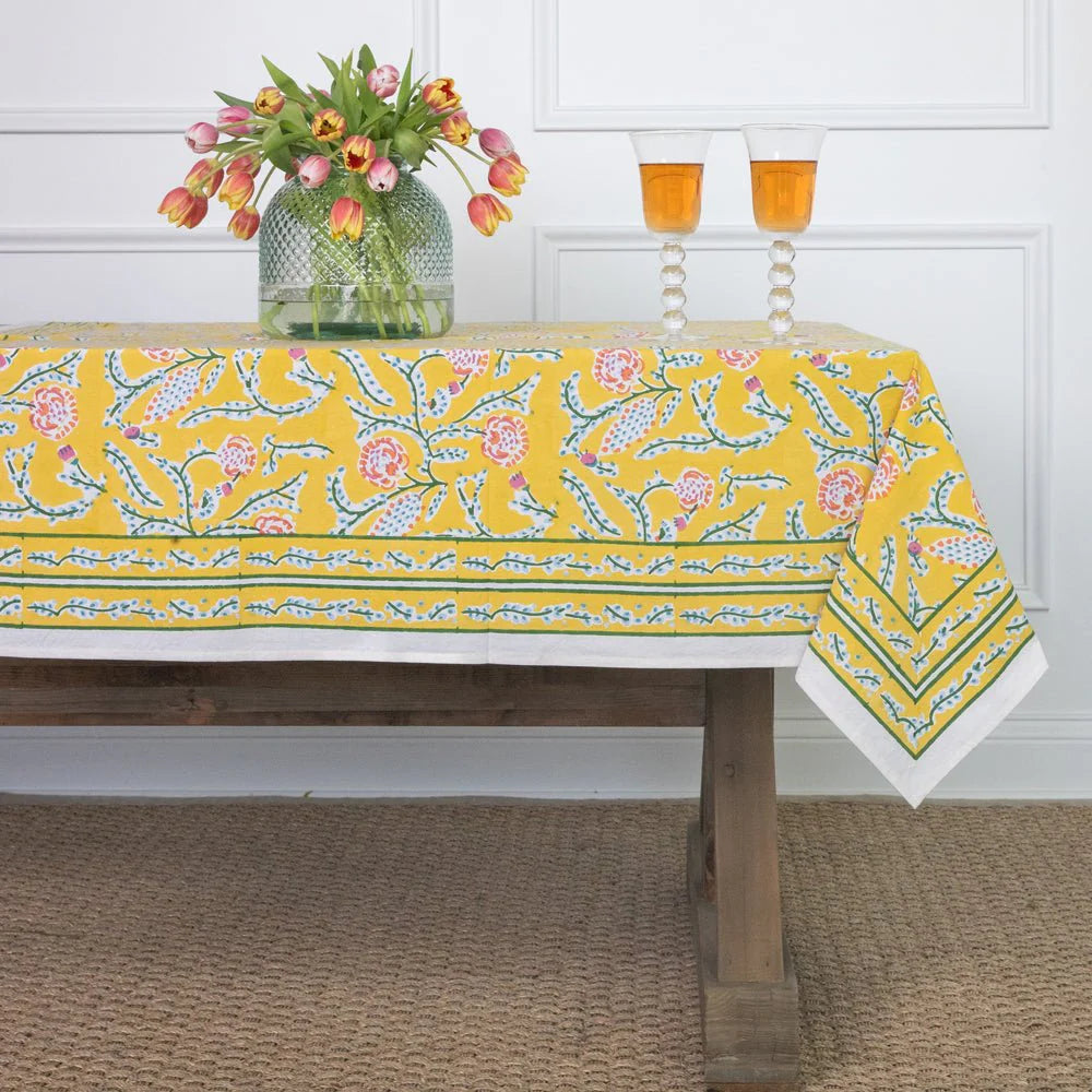 Bring joyful color and timeless craftsmanship to your table with the Climbing Dahlia Sunshine Yellow Tablecloth. This stunning piece is hand block printed on 100% cotton by skilled artisans in India, a process that involves stamping each color individually using intricately carved wooden blocks. The result is a lively and organic design that celebrates traditional artistry and modern charm.