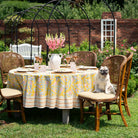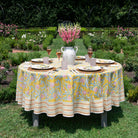A soft yellow backdrop sets the stage for blooming dahlias in coral and curling vines in delicate shades of sky blue and green. The detailed floral pattern dances across a crisp white base, creating a luminous and cheerful tablescape that’s perfect for every season—especially spring and summer. Whether you're hosting a festive Easter brunch, Mother’s Day luncheon, garden party, or simply elevating an everyday meal, this tablecloth adds warmth, color, and style to any setting.